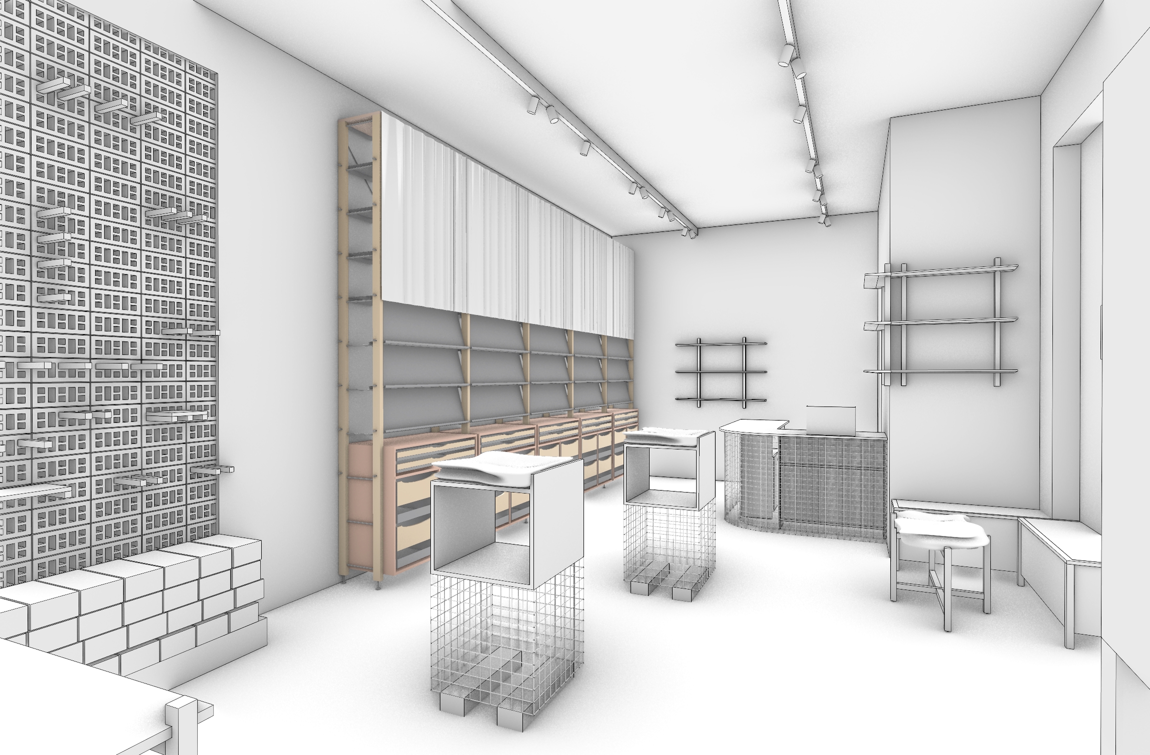 interior of a ceramics supply store and glaze showroom in cape town based on an architectural 3d model the space is a hybrid between workshop material library and retail showroom expressing the transformation of materials from raw to refined architecture layout one main wall with continuous shelving units lower section plywood drawers up to 80 cm height upper section recessed niches with slanted galvanized steel shelves shelves display glazed ceramic tile samples with different finishes vertical pegboard wall displaying pottery tools visible stacked clay bricks stored on lower shelves key elements pos counter with base gabion basket metal mesh filled with natural stones top clean plywood countertop display plinth gabion stone base open wooden shelf heavy natural stone slab top seating nook two benches made from plywood with solid ash seating surfaces coffee table with solid ash wood frame and stone slab top terracotta brick flooring nook partially separated by a terracotta brick lattice screen wall textile elements large window with semi transparent linen curtain with subtle branding linen panels above shelving units up to ceiling materials natural tactile honest light plywood solid ash wood galvanized steel slanted shelves terracotta bricks ceramic tiles and objects linen textiles natural stone slabs steel mesh gabions lighting soft natural daylight entering from window filtered through linen curtain warm track lighting highlighting glaze shelves soft shadows global illumination atmosphere calm tactile contemporary craft space not overly styled slightly raw but refined emphasis on material contrast and texture rendering style ultra realistic architectural interior rendering high detail global illumination natural materials soft shadows subtle reflections no people clean composition
