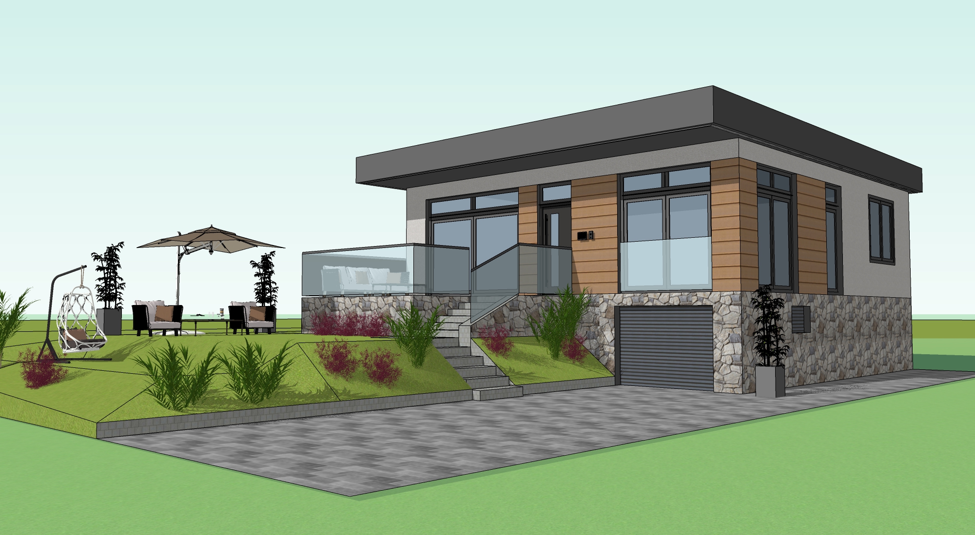 modernist exterior shot cosy and warm house beautifull garden with grass yard around summer day white clouds on the sky birds flying in distance architecture