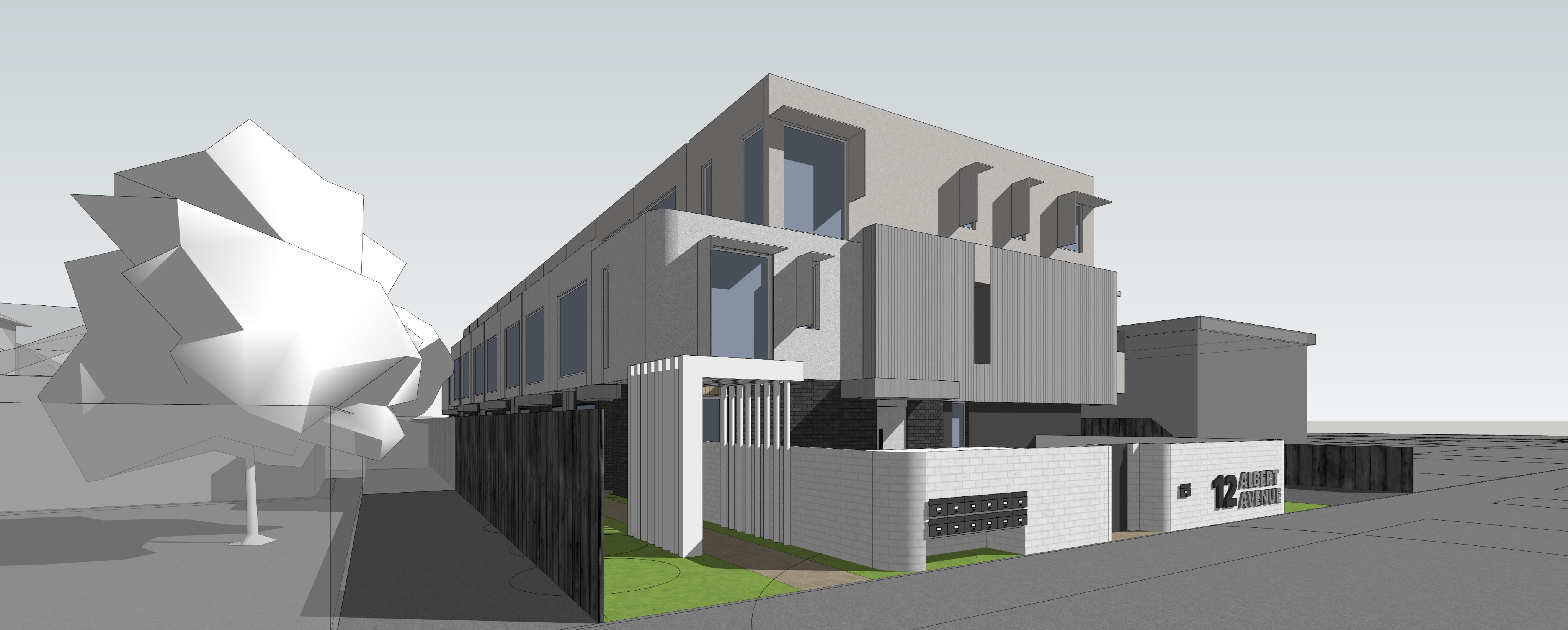 ultra realistic architectural render of a contemporary townhouse development strictly preserving original building form proportions and facade composition use a refined neutral material palette off white textured render light grey concrete and vertical timber battens in light oak finish ensure precise detailing such as clean joints shadow gaps and subtle material texture variation lighting set to soft overcast daylight with diffused natural light minimal contrast and balanced exposure avoid dramatic shadows create a calm professional and evenly lit scene contextualize within a clean suburban melbourne streetscape with restrained well maintained landscaping low grasses minimal shrubs and a few small trees keep surroundings tidy and uncluttered add subtle realism one modern parked car minimal signage clean driveway and pavement soft reflections on glazing no people or crowd slightly desaturated color grading high end real estate marketing style calm and refined composition photorealistic high detail 4k render professional architectural visualization quality