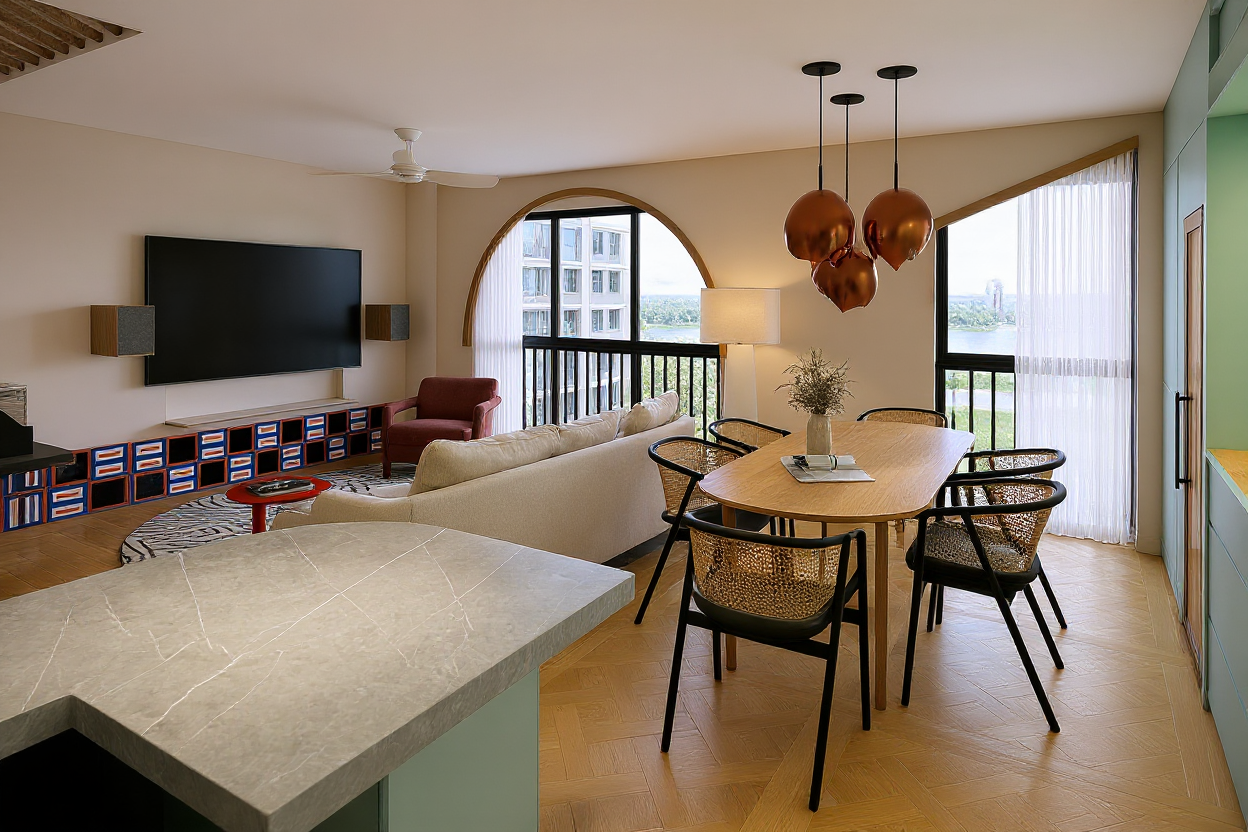 modern house with parapet walls white primary material cream colored brick veriticle wood sidding secondary material composition roof dark grey eaves and parapet caps black window frames