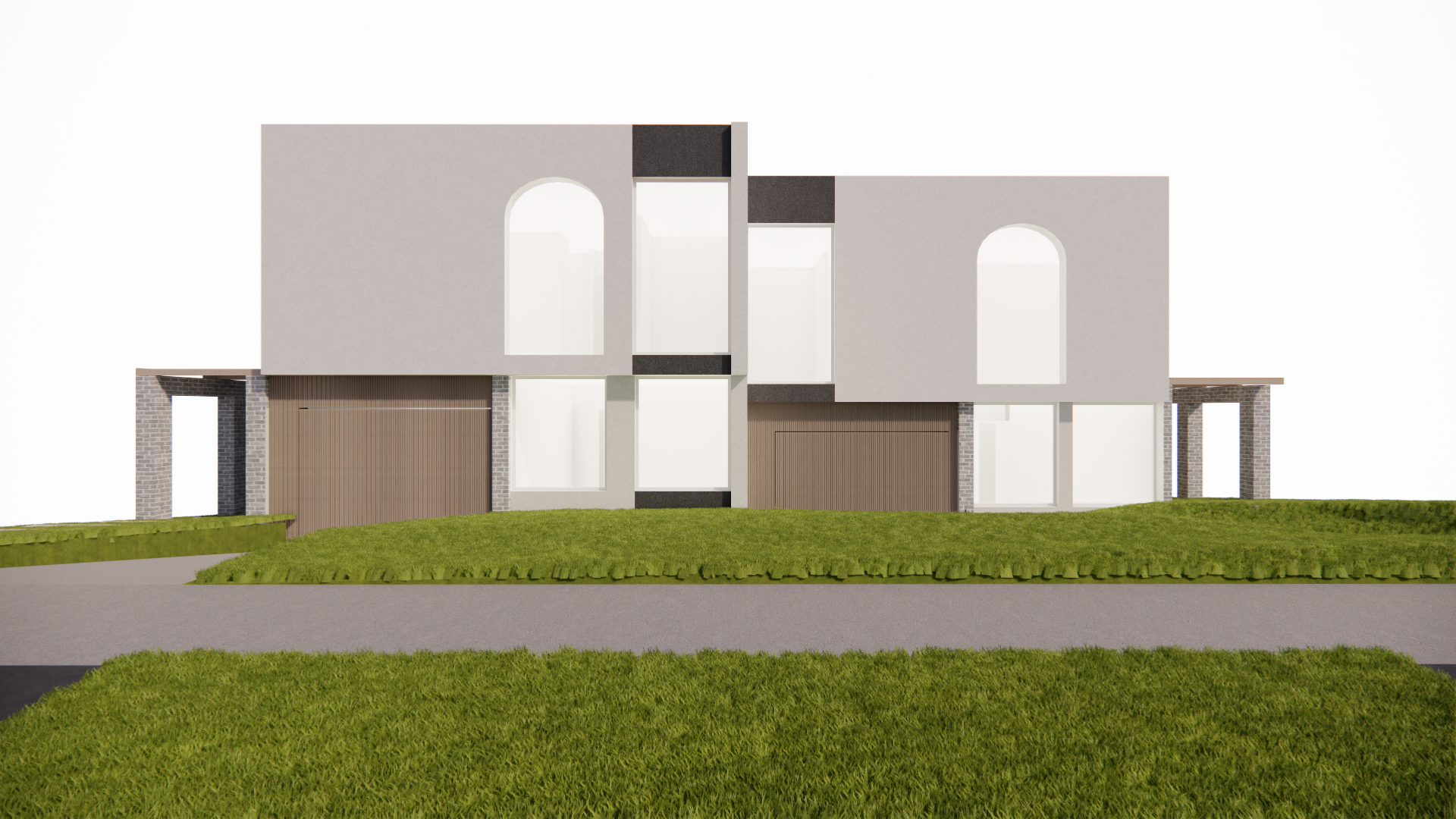 no outdoor furniture with one vehicle access in front of each of the garage the sun behind a trees so warm golden sunlight beams through the branches casting soft rays and subtle highlights realistic and detailed facade textures and a vibrant clear sky with light atmospheric depth render in hyper realistic architectural visualization quality 8k resolution