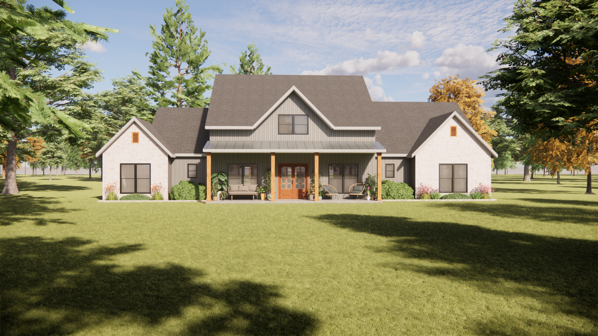 you are a professional image renderer you create the highest grade renderings around and specialize in architectural renderings this is the front elevation of a house create a high resolution photorealistic image of this structure keep the windows as they are where they are keep the doors as they are where they are keep the main structure as it is where it is feel free to change the perspective keep the roofline as it is where is it do not add anything to the structure that i have not asked for the roof is composition shingles architectural style the siding is vertical board and batten darker gray the stone will be a lighter stone that coordinates with the siding color the front door will be wood the background will be a wooded background similar to texas it should be early afternoon with a bright sunny day clear skies the landscaping should be winter with plenty of color and should be that of a luxury estate it is a snowy day the left and right gables are entirely stone
