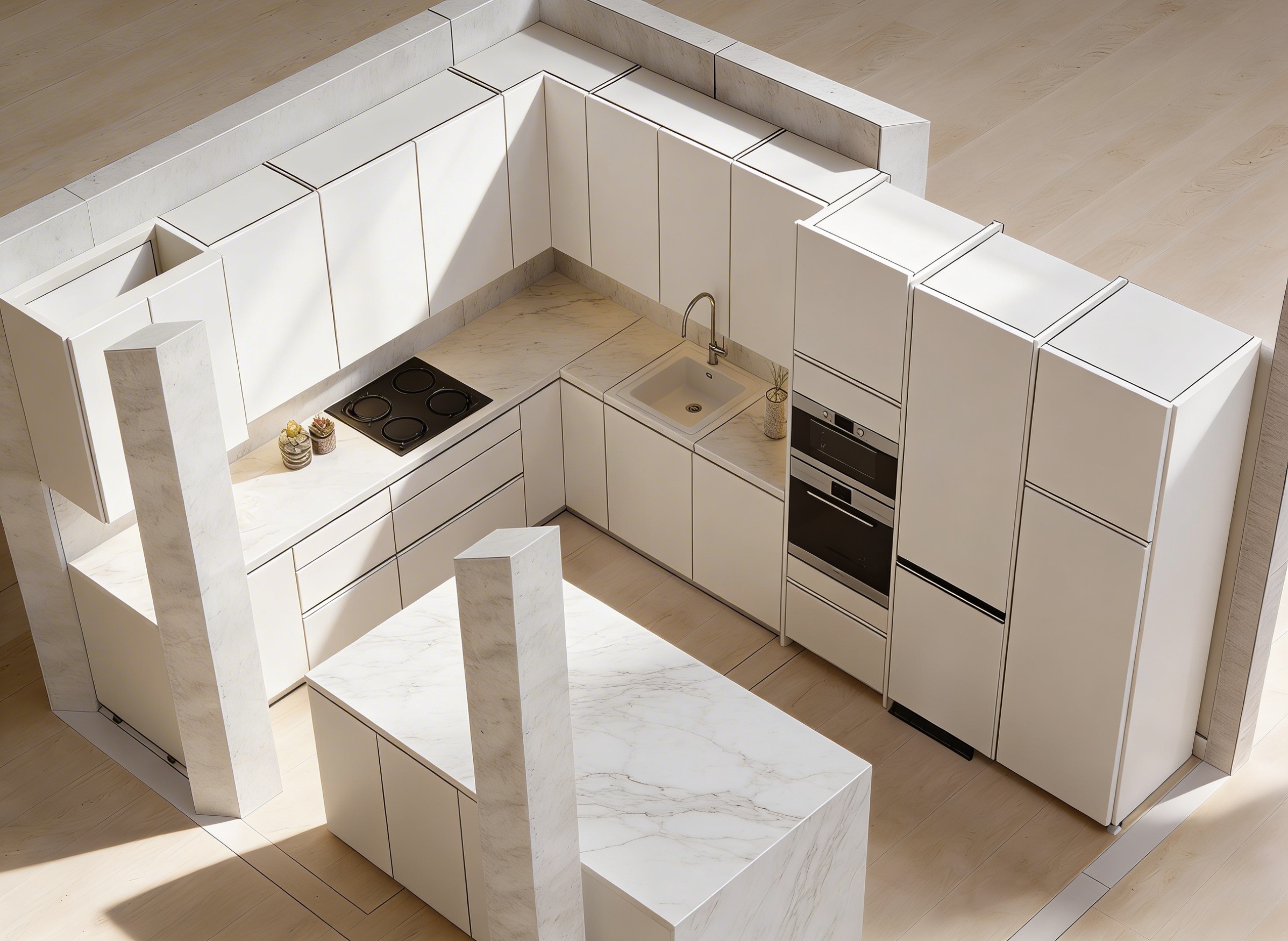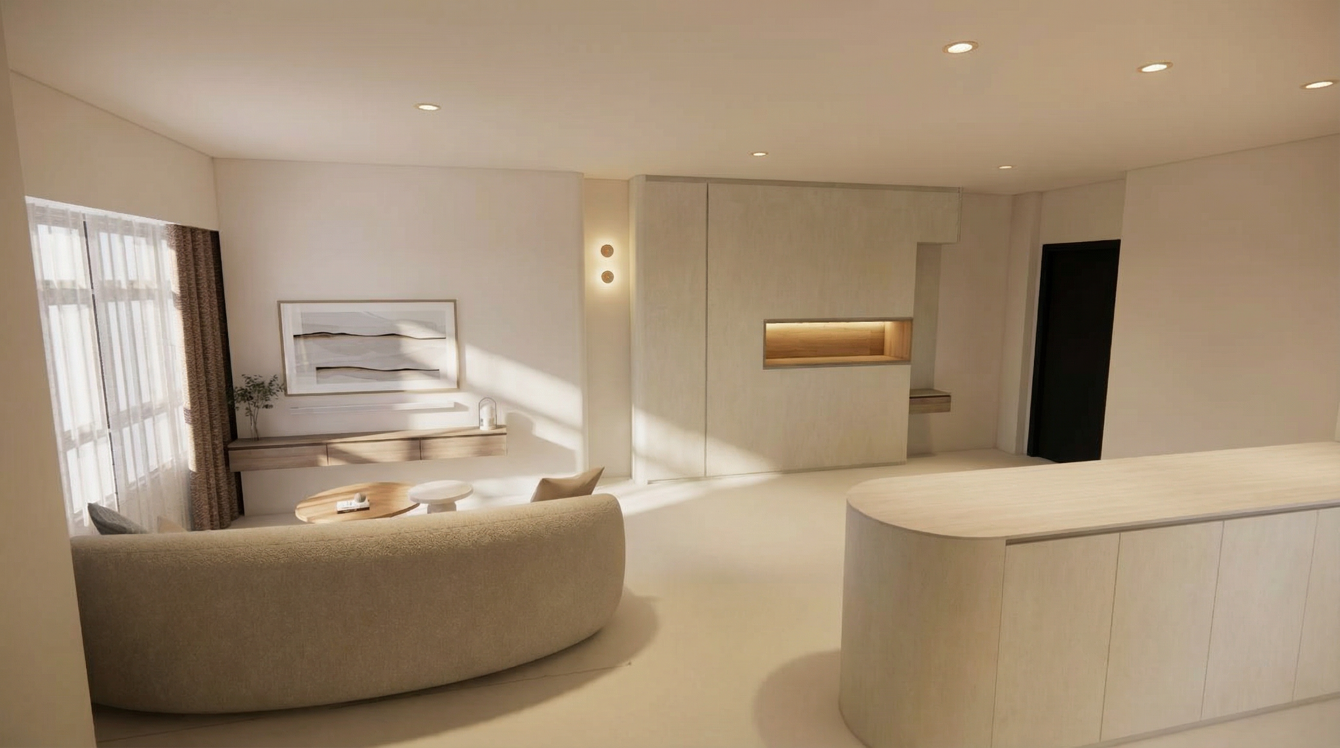 make a photo realistic picture raise the kitchen in white add lights floor woden ad sofa light on stairs and tv stand