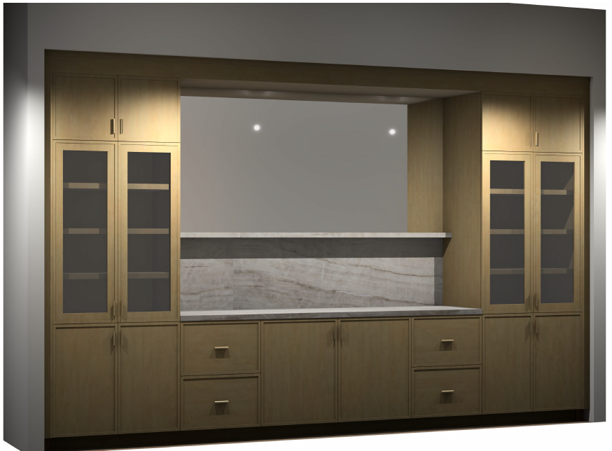 make more photo realistic make floors more of a warm white oak mirror in upper backsplash wood to have less grain backsplash to be taj mahal quartzite