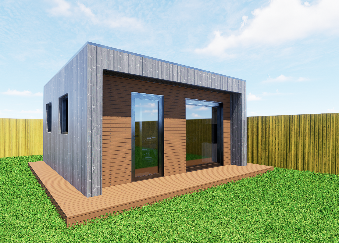 make this exterior image look realistic make the lighting warm summer night with some led downlights under the parapet overhang onto the decking make the timber more realistic a dark brown horizontal timber cladding and the black timber cladding to be vertical landscape the garden ice and have a stepping stone path leading to the decking