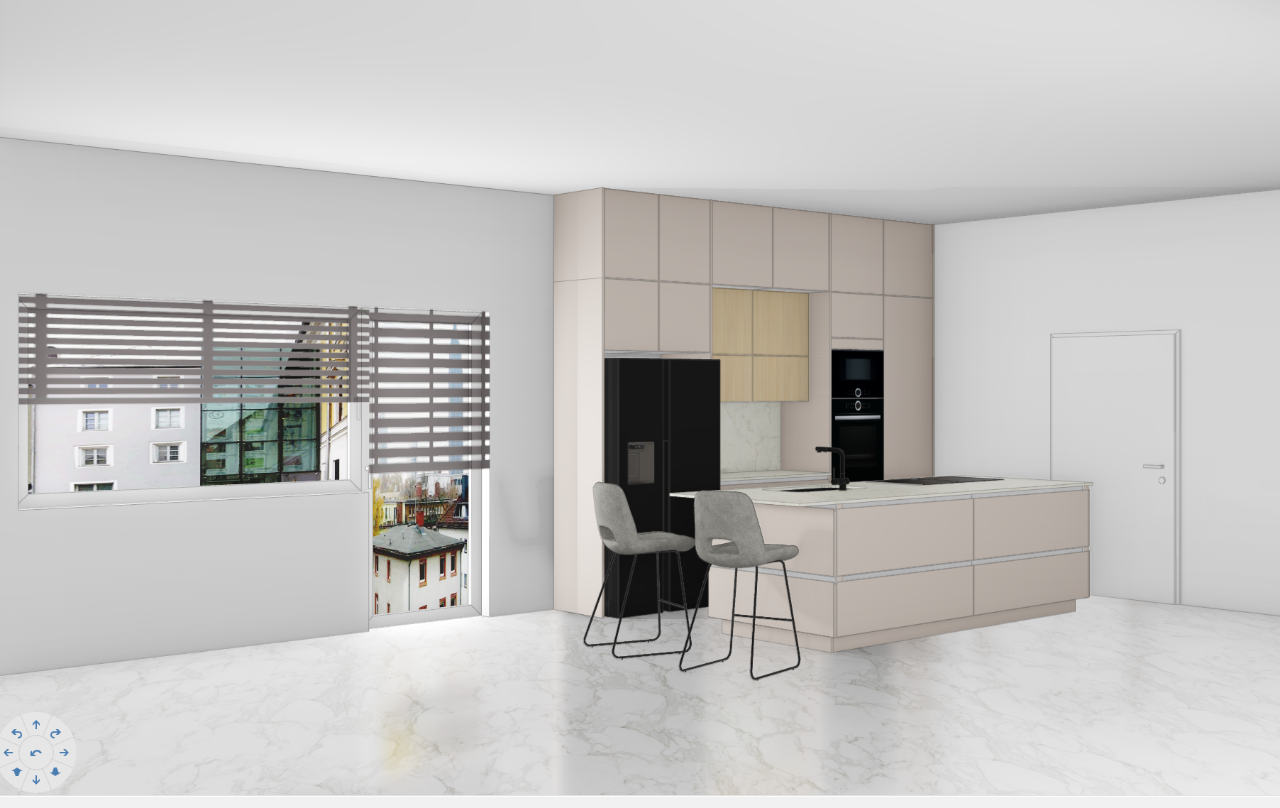 create a modern minimalist kitchen featuring a sleek silk grey cabinetry and a polished marble countertop in soft gray and gold tones add a black high tech refrigerator and oven include two elegant gray bar stools with thin black legs place a wide window with horizontal gray blinds letting in soft natural light focus on a bright airy atmosphere with white marble flooring and smooth white walls aim for a clean contemporary feel with hints of warmth from the daylight streaming through let the wall units fronts stay in wooden decor add other furniture let it be in the same style and add decoratins and wall decorations preserve the position of the home appliances and the position of the sink and tap do not change the position of the appliances