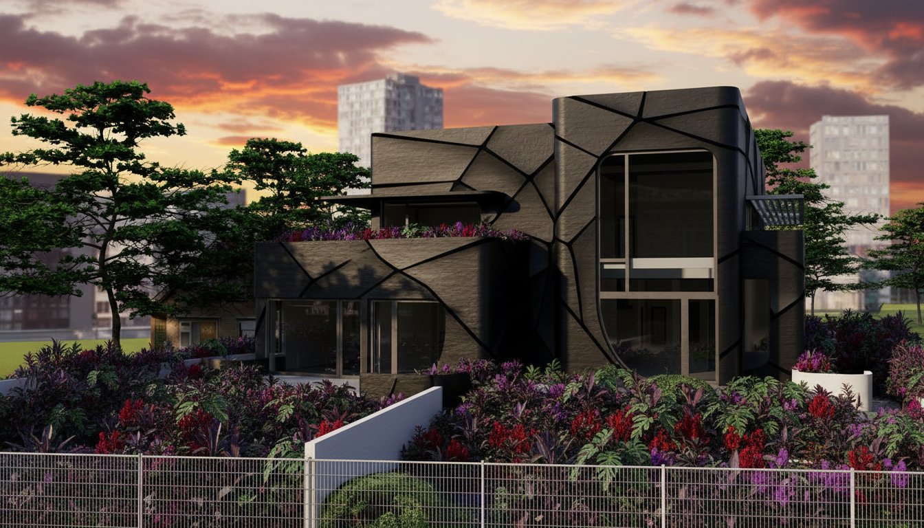 zaha hadid night shot dark colored sprout nice textures urban environmant beautyful sorounding vegetation daylight with beautyful redish yelowish clouds outside ambiantal illumination cinematic view architecture