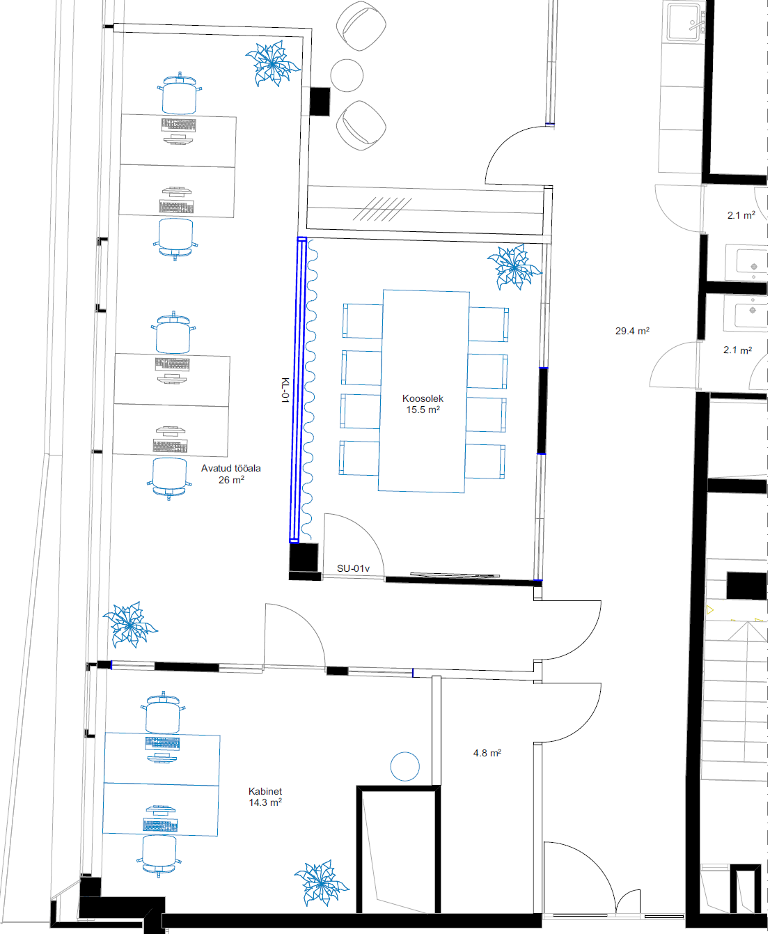 transform this 2d architectural floor plan into a photorealistic 3d interior scene preserve the exact layout proportions wall positions doors and windows as shown in the plan create a modern office interior with three main zones open workspace with desks and task chairs meeting room with a central table and surrounding chairs private office room use realistic materials light oak desks and furniture with visible wood grain neutral fabric task chairs glass partitions for meeting room white painted walls light grey carpet flooring subtle indoor plants as shown in plan add accurate architectural elements correct door placements and swing directions window positions with natural daylight entering ceiling with simple modern lighting fixtures lighting soft natural daylight from windows balanced artificial office lighting realistic shadows and ambient occlusion camera eye level perspective 35mm lens wide view showing multiple spaces connected style clean modern scandinavian office design minimal functional professional atmosphere ultra realistic architectural visualization high detail physically accurate lighting v ray style rendering