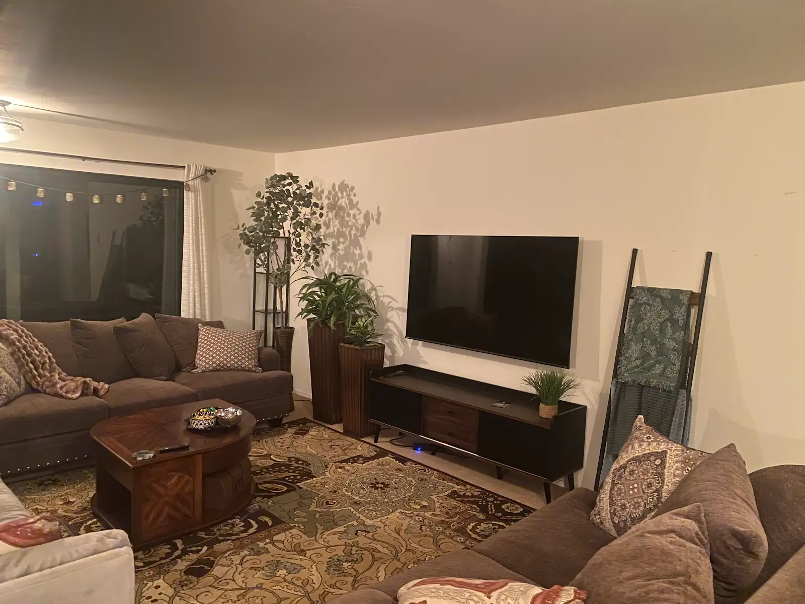 use this image as a base for my instructions tv wall make a long modern open flame fireplace with a dry walled overhang with a roll back wall to hide the tv walls should be painted in a light white with sage undertone in a roman clay finish coffee table should be a modern wood table with refined stump base couches should be a mid entry modern style with white linen fabric and chrome add mud in recessed lights to celing to accent the space use terrocatta pot lamps to accent the space