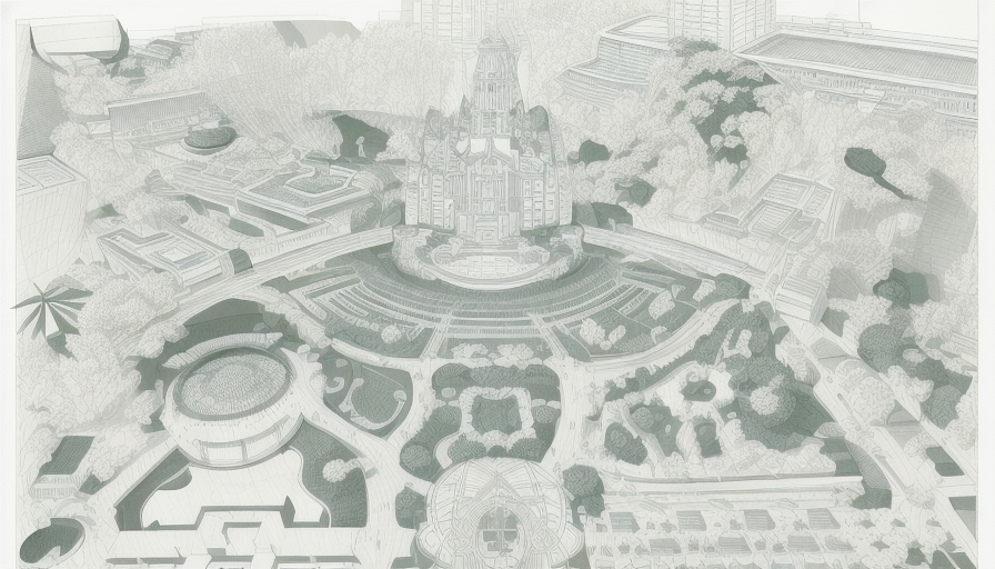 redraw as a clean vector like ink line drawing in pure black on pure white preserve only the main masses and axes central building concentric terraces paths ponds primary alleys a few major adjacent blocks no midtones no gray pixels no pencil texture no paper texture continuous black ink outlines with clear hierarchy thick outer contours for primary masses thinner inner lines for secondary details flat white background no hatching no cross hatching no stippling no gradients simplify vegetation into schematic shapes sticks tufts remove small clutter and crowd technical cad like outline quality crisp closed paths vector illustration linework not pencil not sketchbook