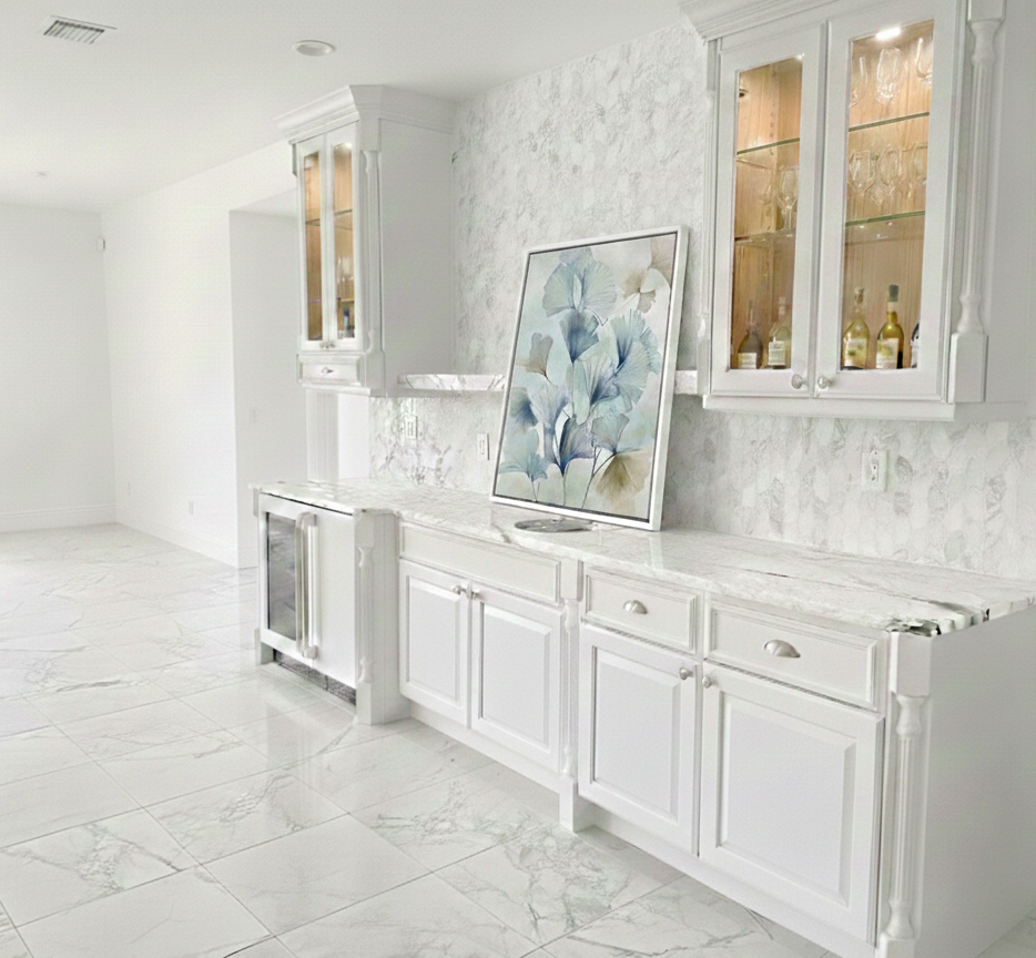 remove painting from countertop and place it on the shelf between the 2 upper cabinets