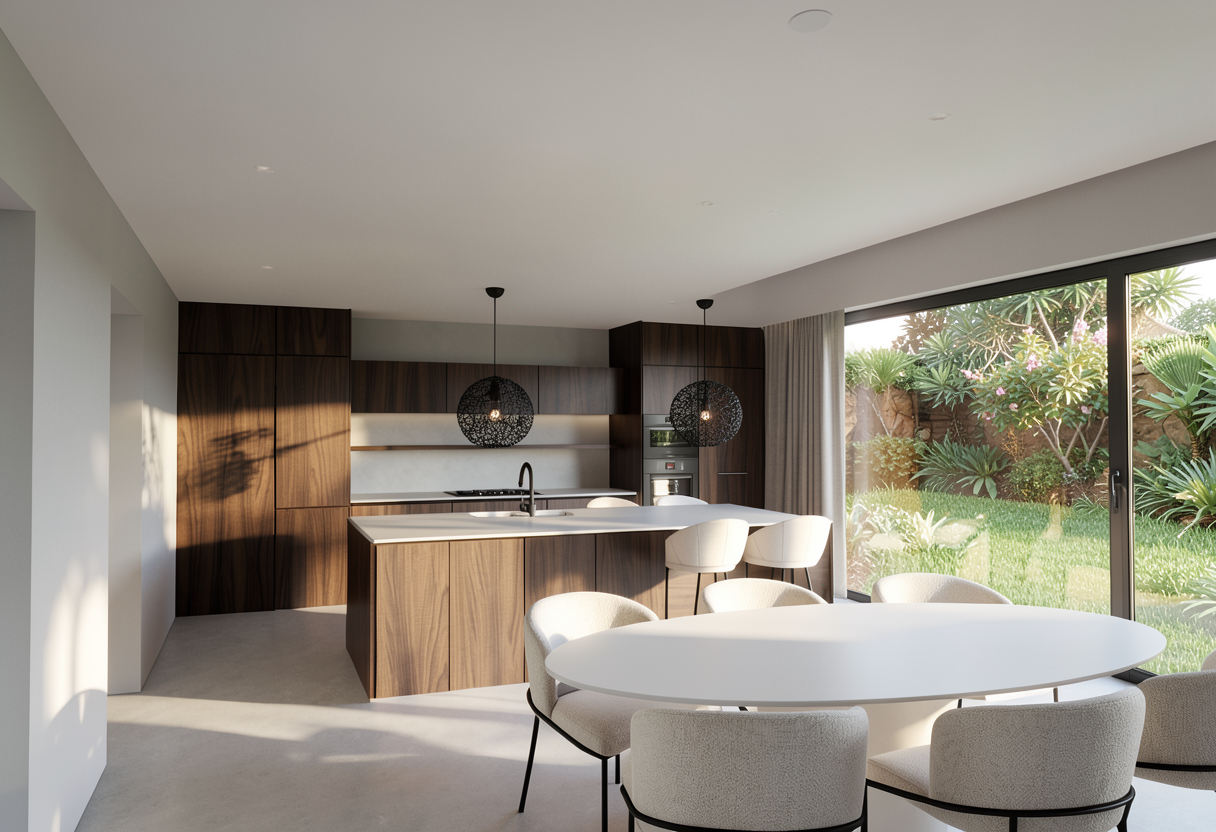 render a modern kitchen interior with a refined and elegant atmosphere use rich dark walnut wood for the cabinets and island the countertops and the backsplash both under and on top of the floating wall units should be a light microcement matt finish the pendant lights hanging above the island are black and intricately designed casting delicate shadows the chairs around the white round dining table are upholstered in a soft off white fabric paired with minimalist black metal legs through the large sliding glass doors which run all the way to the ceiling display a lush green garden full of vibrant foliage basking in soft afternoon sunlight the walls are smooth and light creme enhancing the clean contemporary japandi feel
