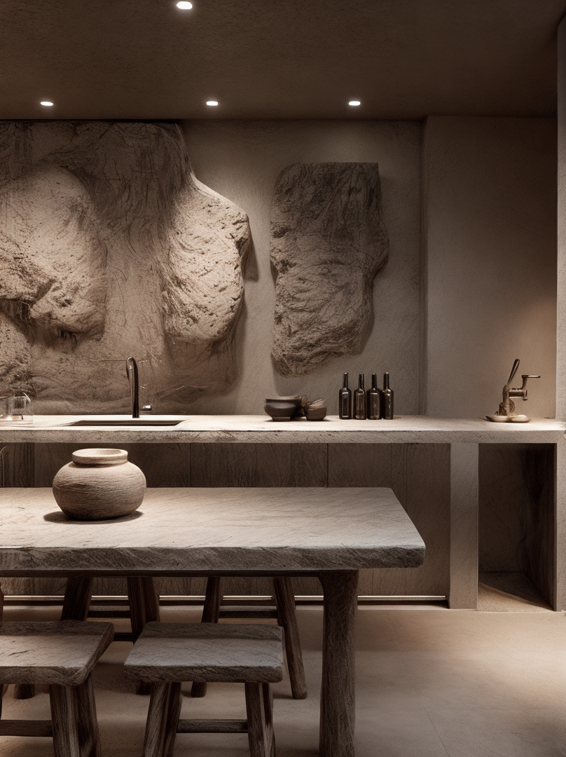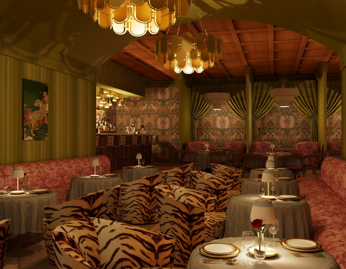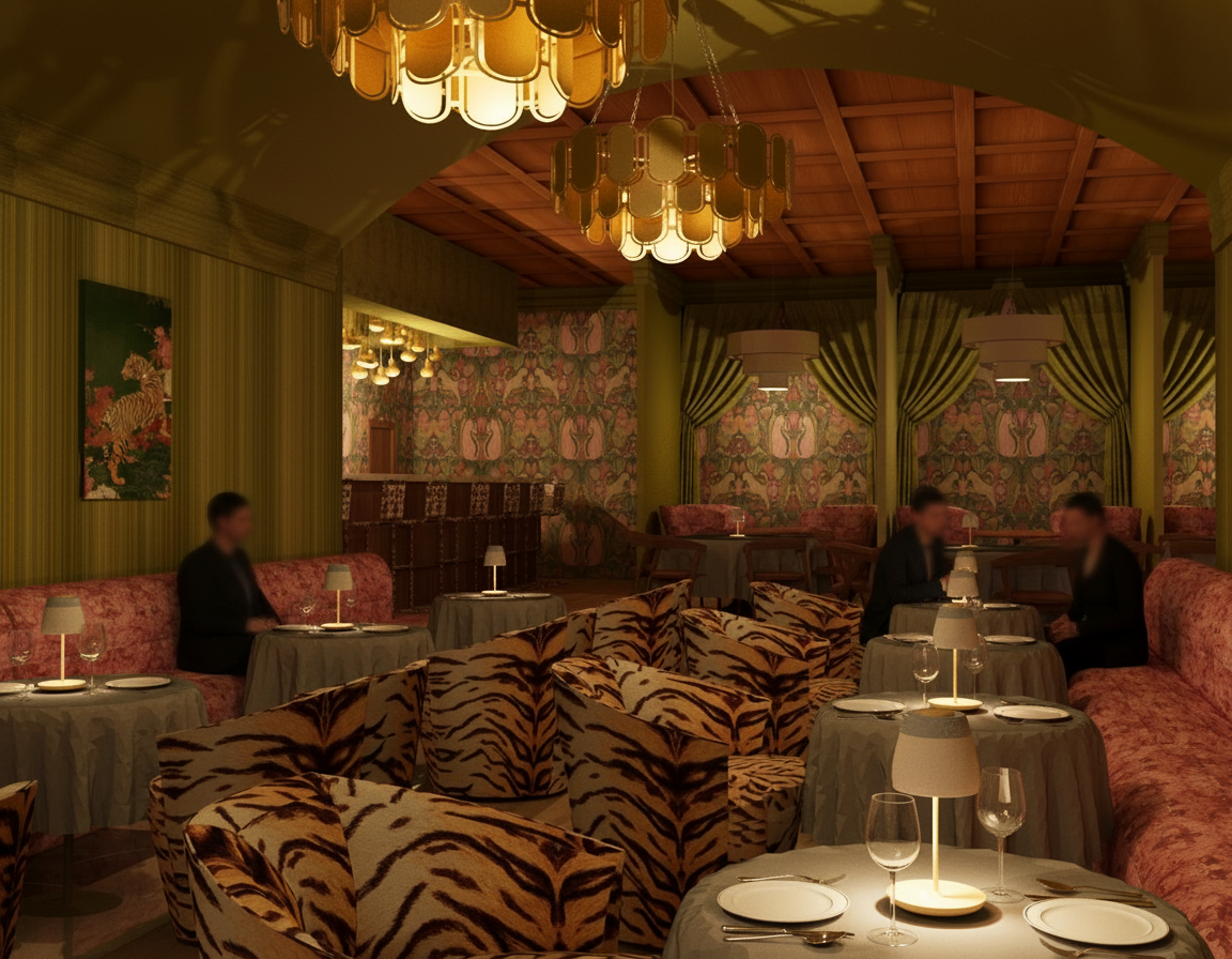do not change the original material patterns add restaurant accessories add more similar decor on walls keep original colors make people less distracting