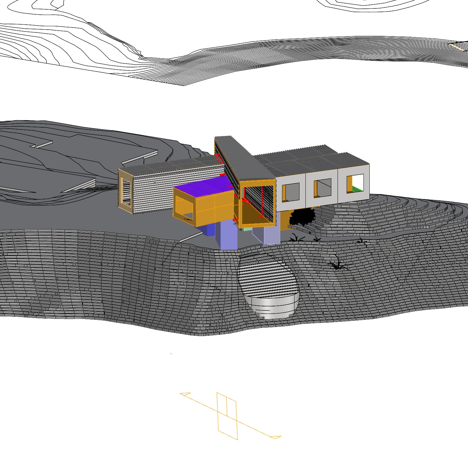 render the building in this image with soft textures the roof is a corrugated metal roof the walls are metal panels look rustic render the image so it architectural dimension overlay make it look like a technical sketch