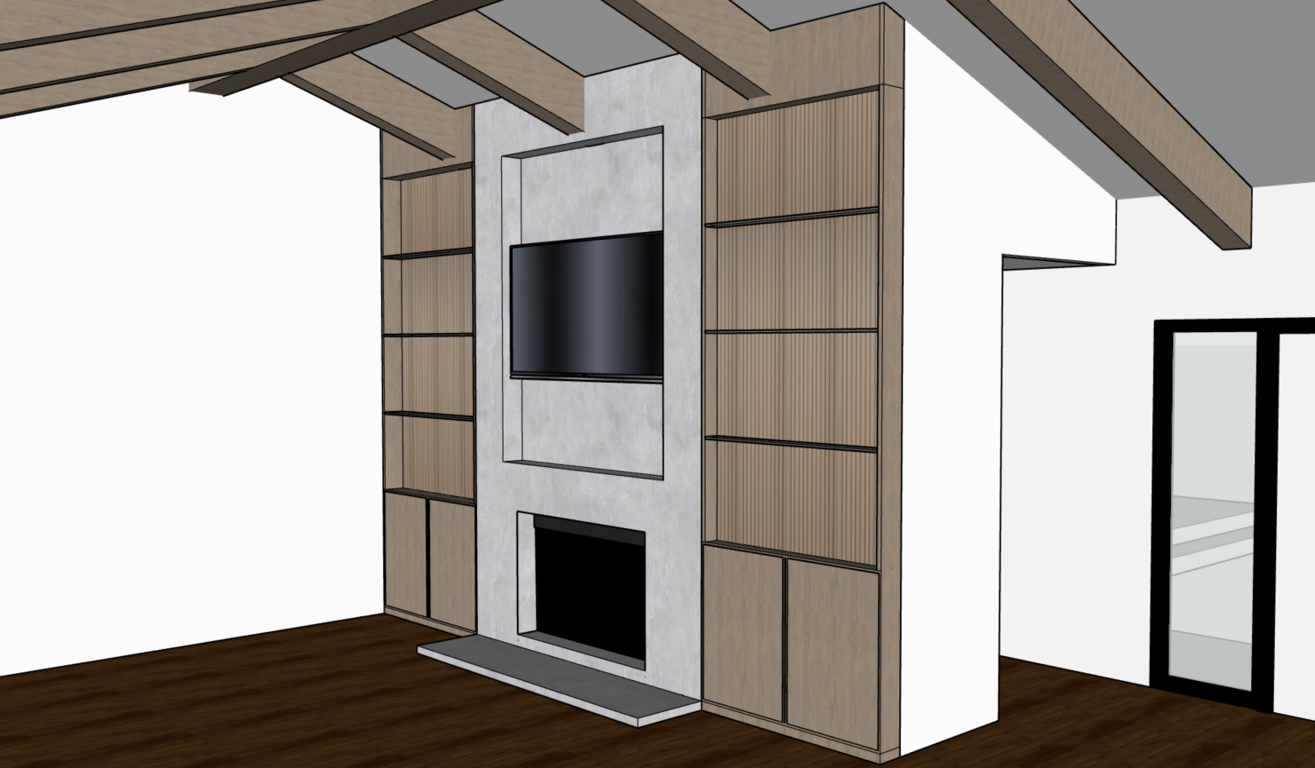 create a modern living room interior featuring a central wall with built in wooden shelves and storage units in soft oak tones incorporate a sleek ultra thin black flat screen television mounted above an elegant minimalist black fireplace use smooth light gray stone panels for the wall complementing the warm wooden textures add subtle ceiling beams in rich walnut hues for architectural depth the atmosphere should be cozy and sophisticated with soft natural lighting creating a serene and inviting ambiance