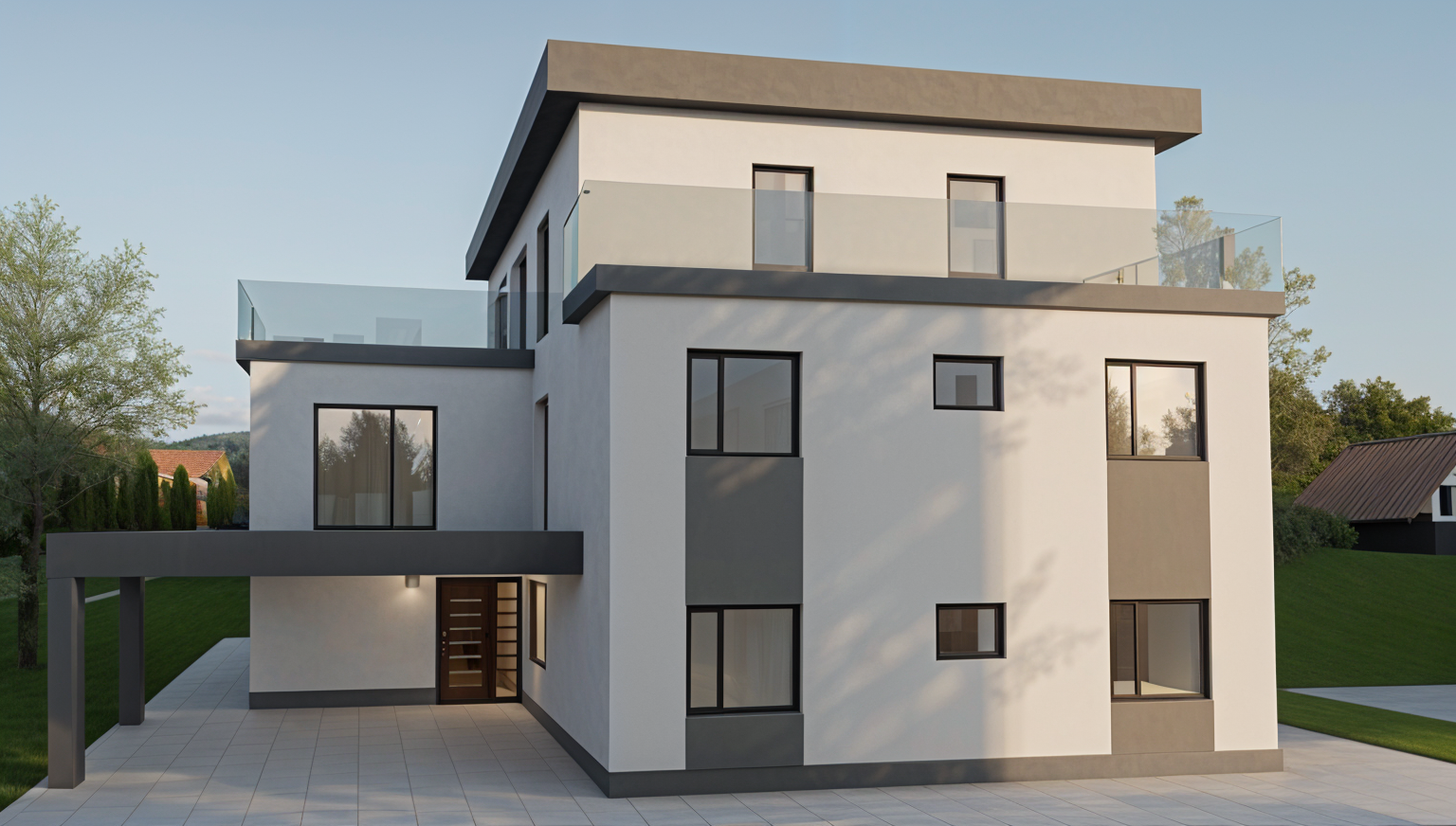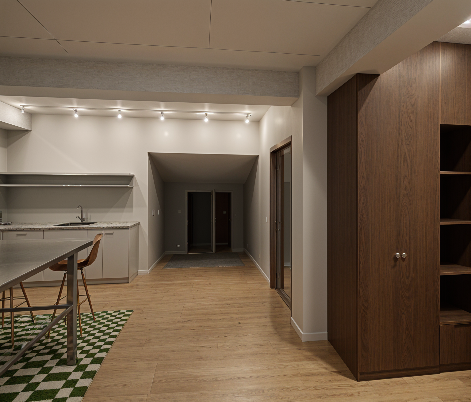create a luxurious dining room interior with a rustic yet elegant atmosphere use a neutral color palette with cream walls and light beige wood flooring feature dark wooden ceiling beams for contrast center the room with a large ornate chandelier in black metal and glass include a robust wooden dining table with matching chairs upholstered in beige fabric incorporate a richly patterned persian style rug with deep red and blue tones beneath the table for a modern touch add a wine cellar with sleek black framed glass doors and gray stone walls ensure ample natural light streams through large windows enhancing the warm and inviting feel of the space rotate table 90 degress