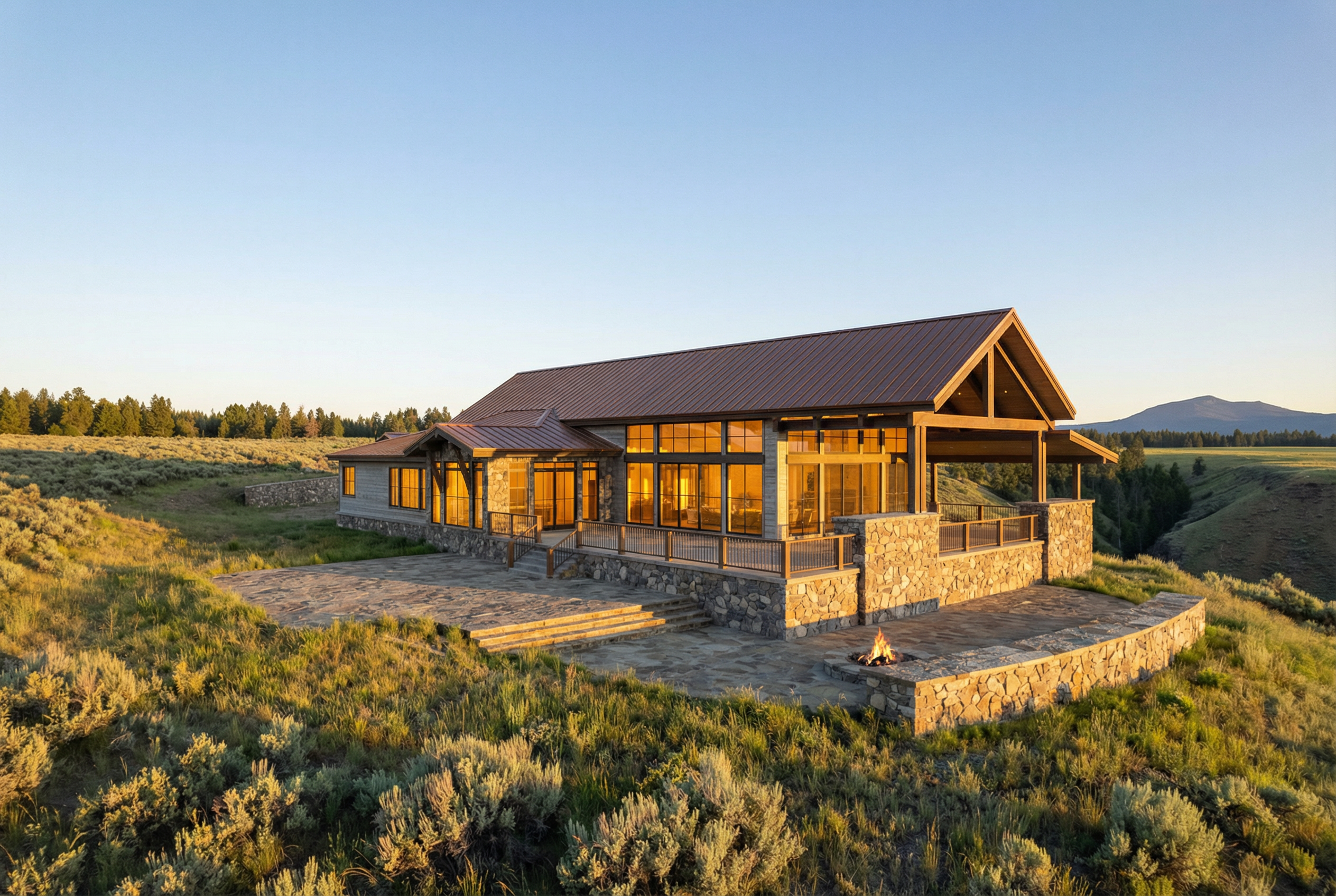 geometry lock highest priority treat the input as a strict elevation reference do not change the shape of the structure in any way do not modify resize reposition or redesign any windows or doors keep all window and door proportions mullions and alignments exactly as shown do not alter rooflines corbels timbers or structural elements materials enhance only keep exact placement maintain all materials exactly as designed do not reinterpret or relocate them lap siding realistic ghost wood siding jackson hole style same locations rock on walls keep exact pattern and layout increase realism only foundation replace all visible concrete with realistic rock veneer roof copper standing seam lighting render quality golden hour exterior lighting warm interior glow visible through windows realistic shadows depth and material texture site environment montana open field setting with native montana vegetation no trees on left no trees on right trees only far in the distance small mountain far in the distance to the right terrain left side slopes slightly upward hardscape keep design intent exact rock slab patio at front patio steps down to the right of the porch patio wraps around to the front of the deck patio extends to the far back corner of the upper deck add firepit on patio foundation walls should show rock only no exposed concrete final instruction enhance realism only do not redesign reinterpret or adjust any architectural elements preserve the exact structure window and door sizes and overall proportions