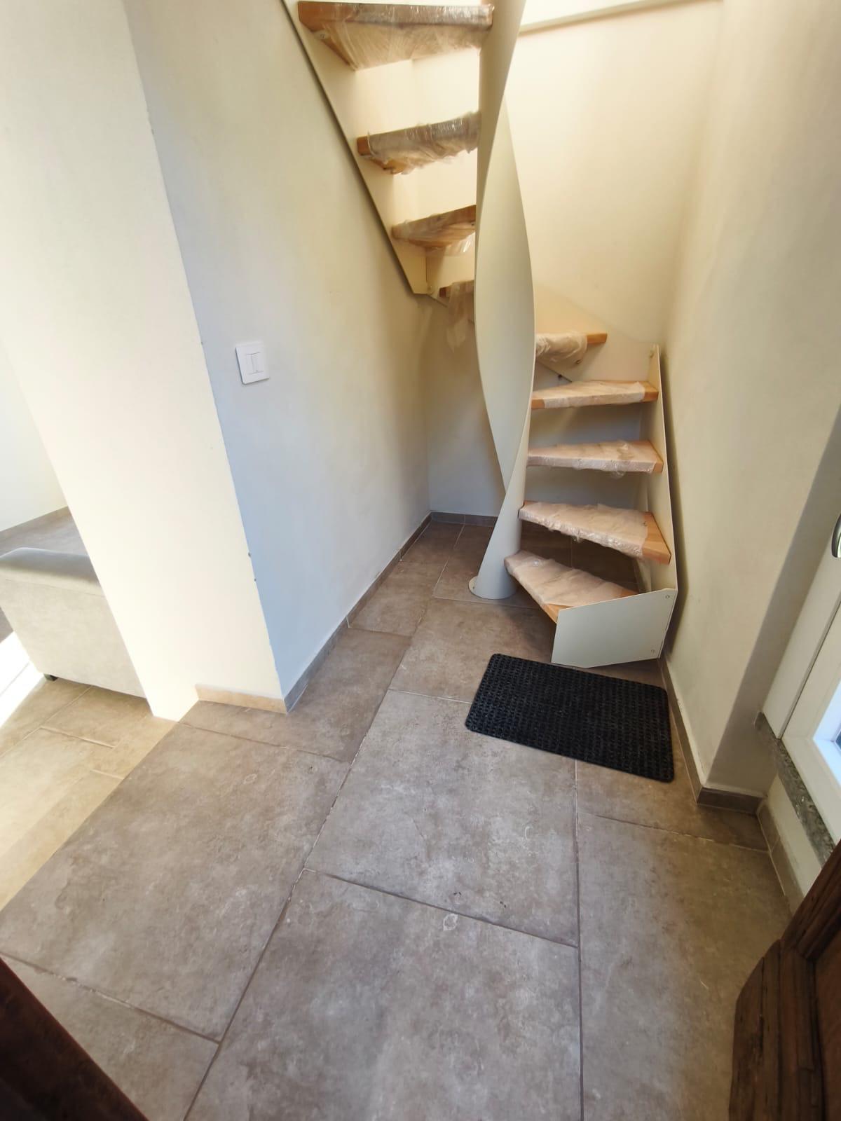change teh angle and make it straight remove the plastic from the stairs the final image should look like a real photograph with a clean modern white cabinet replacing the previous one