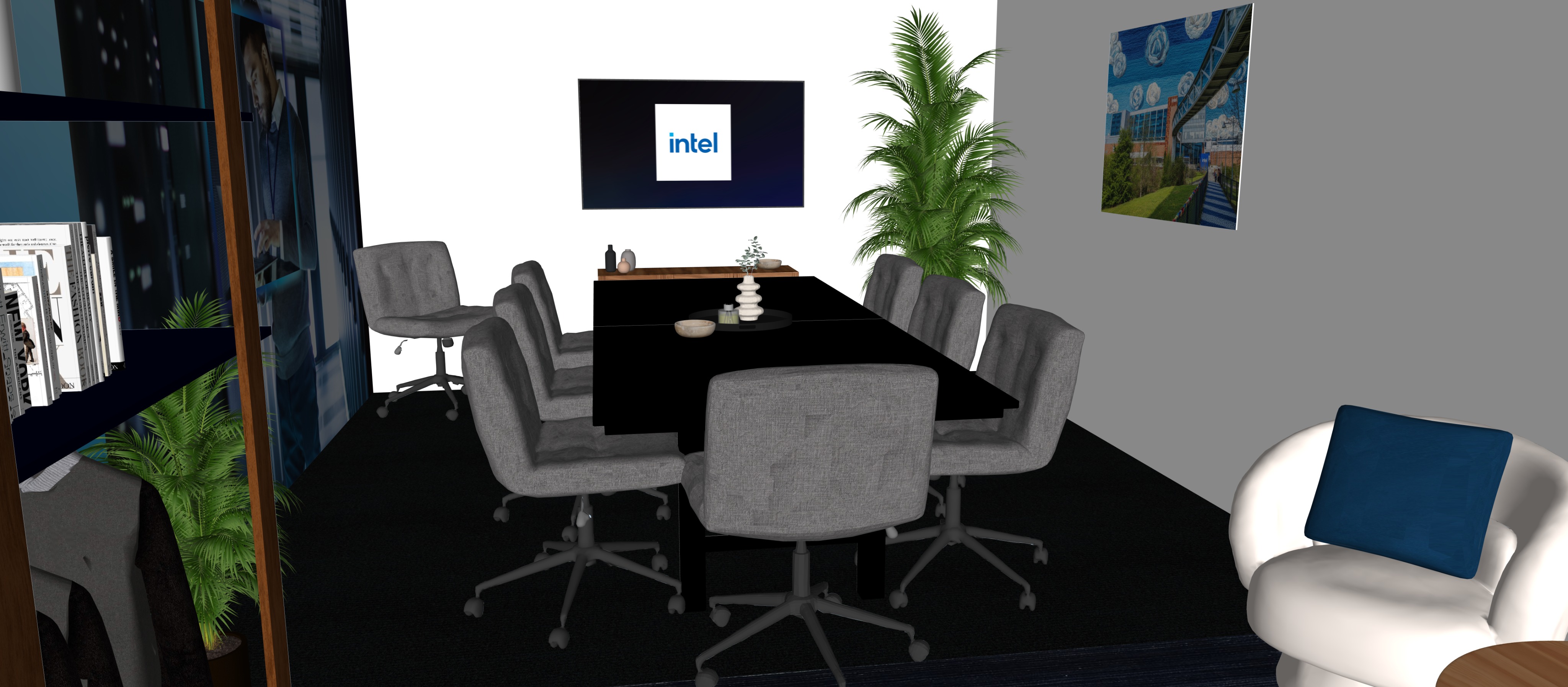 make photo realistic do not change colors or textures or add or remove anything do not change the color of the shelves on the shelving unit they should be the dark blue as shown in the reference image the right wall should be white not grey preserve 16 9 aspect ration of image do not add indirect lighting and use a clean white global illumination