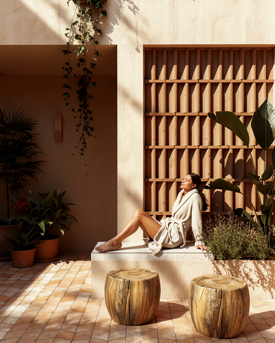 modify only the white cushion under the woman do not change anything else in the image the cushion must be a rectangular bench cushion not a large block reduce its height and volume to a normal seating proportion use natural white fabric with subtle texture show slight realistic compression from the woman s weight with minimal folds keep it clean controlled and realistic