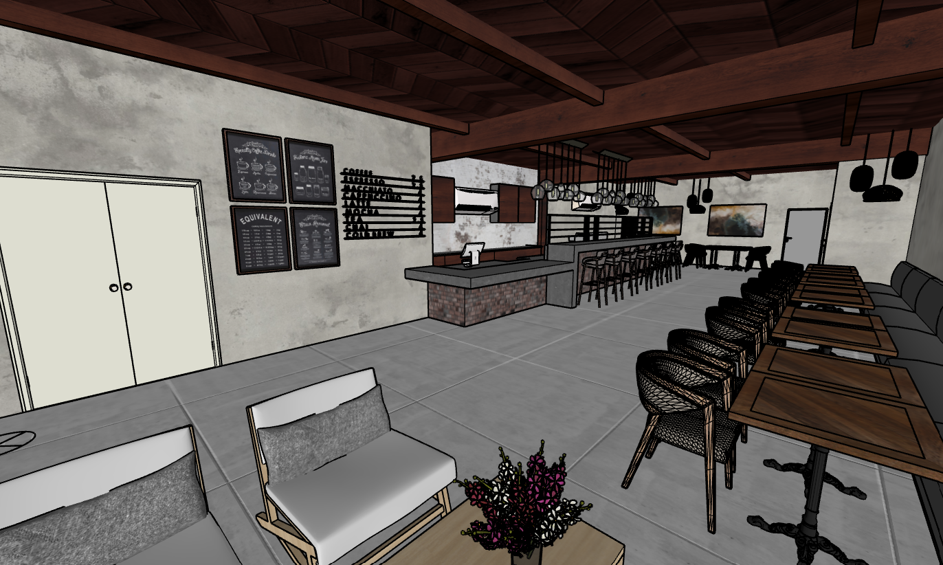 ultra photorealistic interior architectural render of an industrial modern caf critical instruction do not modify move add remove resize or reinterpret any walls columns ceilings doorways windows openings floor plan or spatial relationships do not add new architectural elements preserve the existing layout exactly as provided only enhance materials finishes furniture lighting and d cor within the current boundaries material upgrades only no structural changes existing walls re finished as exposed concrete or smooth plaster with subtle industrial texture existing ceilings remain unchanged but finished with exposed concrete and visible blackened steel elements all existing structural elements remain in the same locations finished in matte black or dark steel flooring material upgraded to polished concrete or large format matte stone same floor footprint furniture enhancements no spatial changes replace existing furniture with industrial modern caf furniture in the same locations black metal frames with solid natural wood tops oak or walnut simple minimalist silhouettes no bulky or decorative forms upholstered seating in leather or dark neutral fabrics brown charcoal black integrated power outlets and usb ports discreetly built into tables and counters only lighting within existing fixtures or locations upgrade lighting to industrial pendant fixtures with matte black or brushed brass finishes warm ambient lighting with soft realistic shadows no new light locations only enhanced fixture style and lighting quality styling details minimal intentional clean lined shelving styled with curated caf d cor books ceramics coffee accessories subtle greenery in simple planters used sparingly minimal signage and branding in brushed metal or matte black surfaces remain clean uncluttered and refined overall mood modern industrial caf aesthetic sophisticated warm and inviting designed for college students study friendly social and comfortable raw industrial character softened with warm wood and lighting render quality ultra high resolution photorealistic textures accurate global illumination realistic reflections and material depth eye level camera angle professional architectural visualization quality