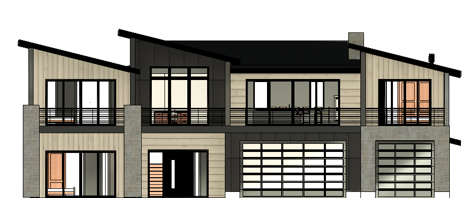 a mountain scape high end subdivision with an acre of property the lot is sloped from the back of the lot towards the front and has a retaining wall out both side of the house house materials are a silvery wood siding black siding natural stone windows doors and garage doors are black driveway is out from the garage doors the door on the bottom far right is also a garage door