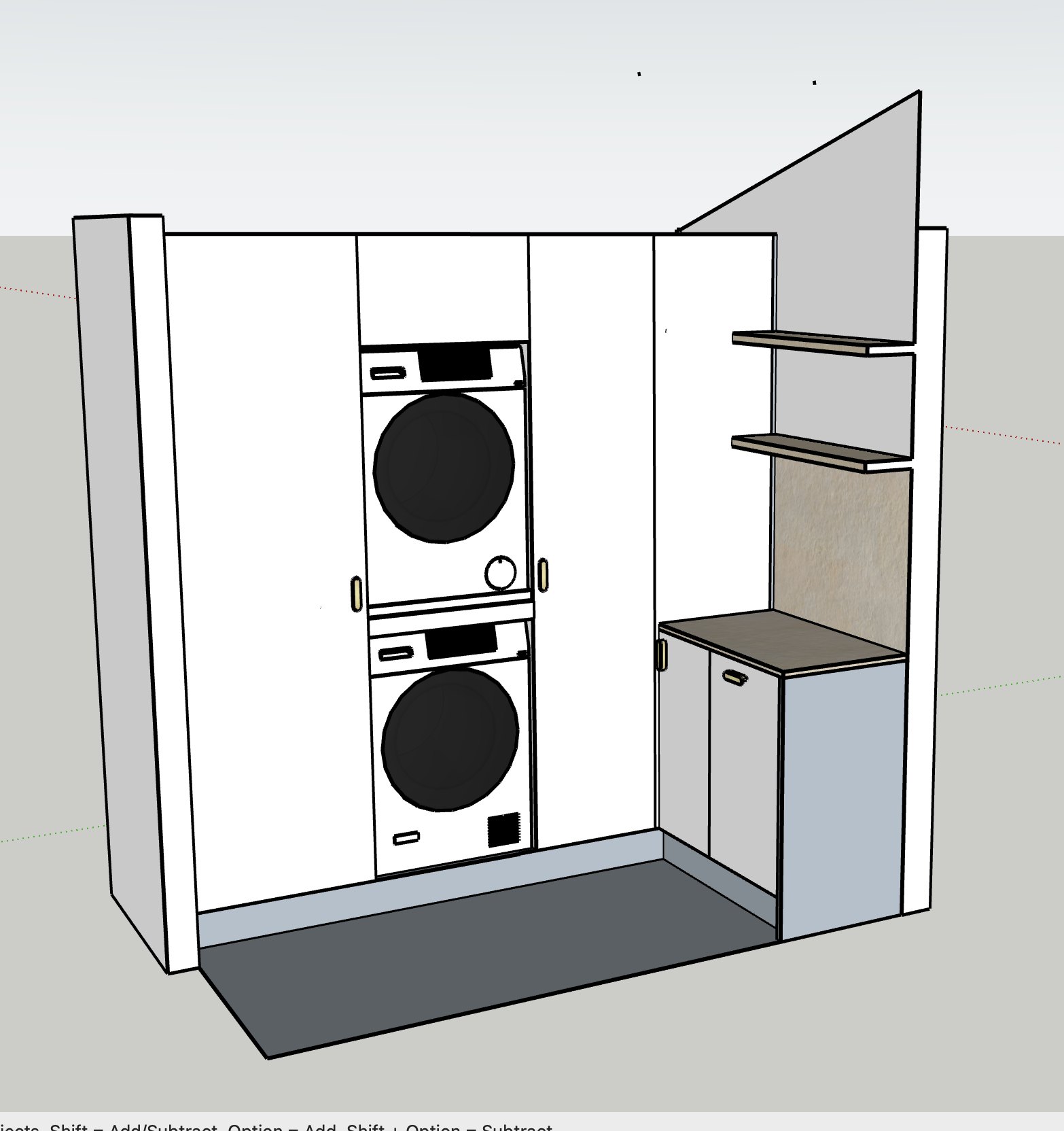 create a render of this laundry with raked ceilings white cabinets and stainless steel washing machine and dryer the stone and splash back is taj mahal quartz