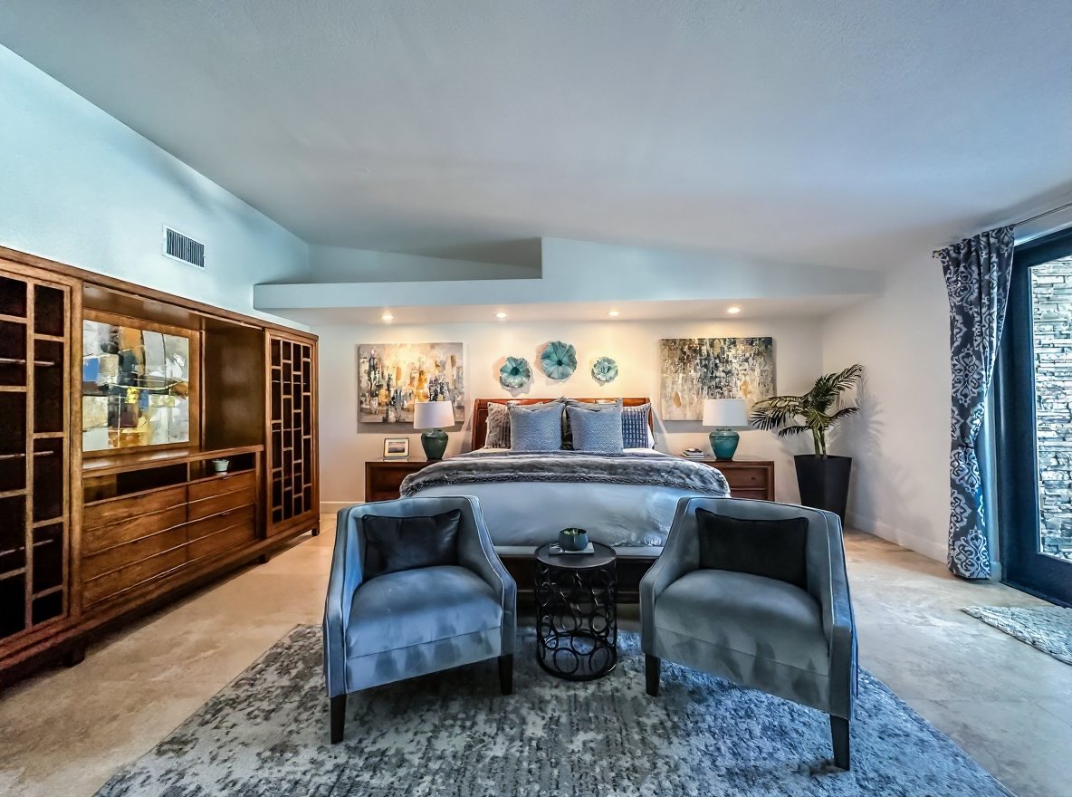 clean up ceiling remove all a c vents remove vent above entertainment center keep ceiling fan and brighten image remove candles on fireplace remove chair in the corner
