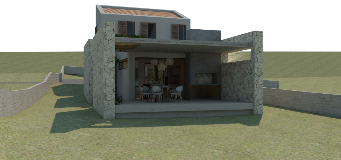 sunny day add mediterranean low vegetation turn on the pendant lights on terrace turn on fire in fireplace