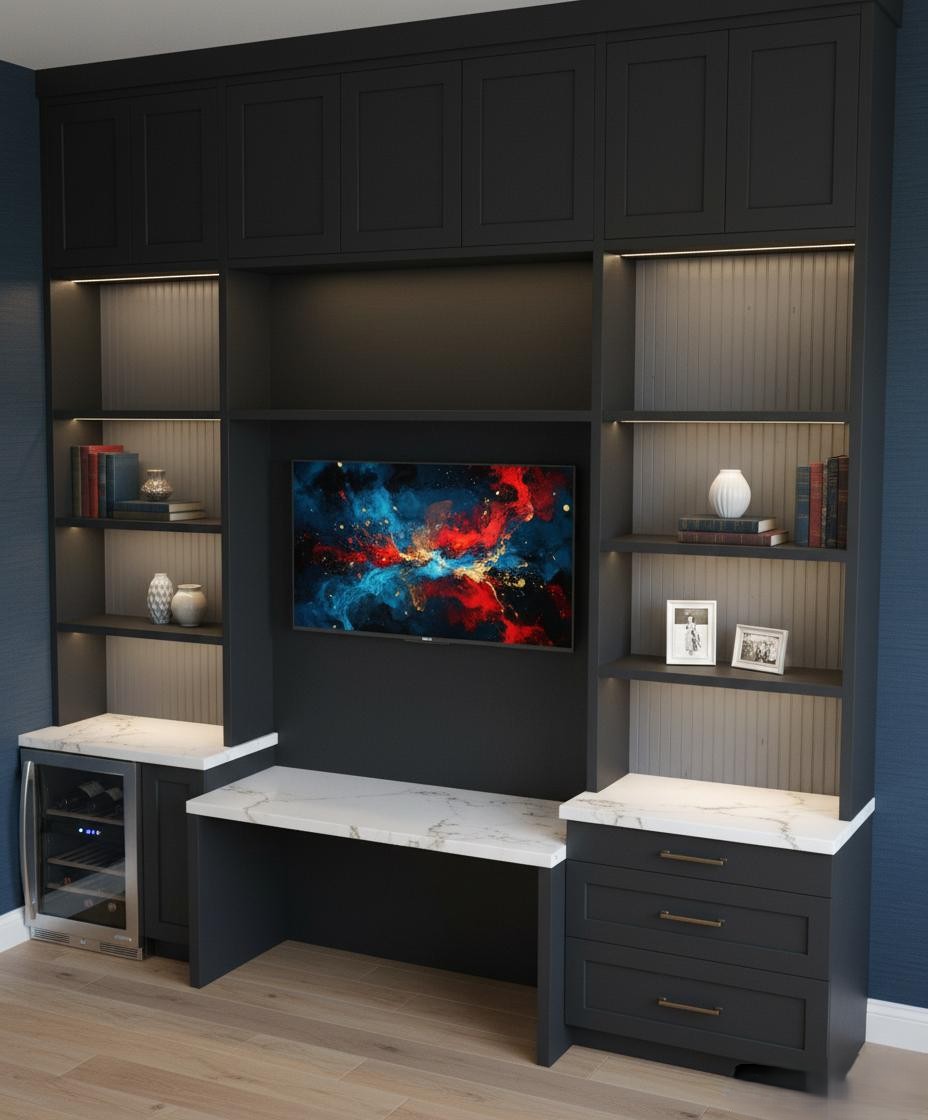 interior shot office cabinets with soft lighting and some natural light cabinets have bronze door handles and a broadway black paint the countertops are a quartize material