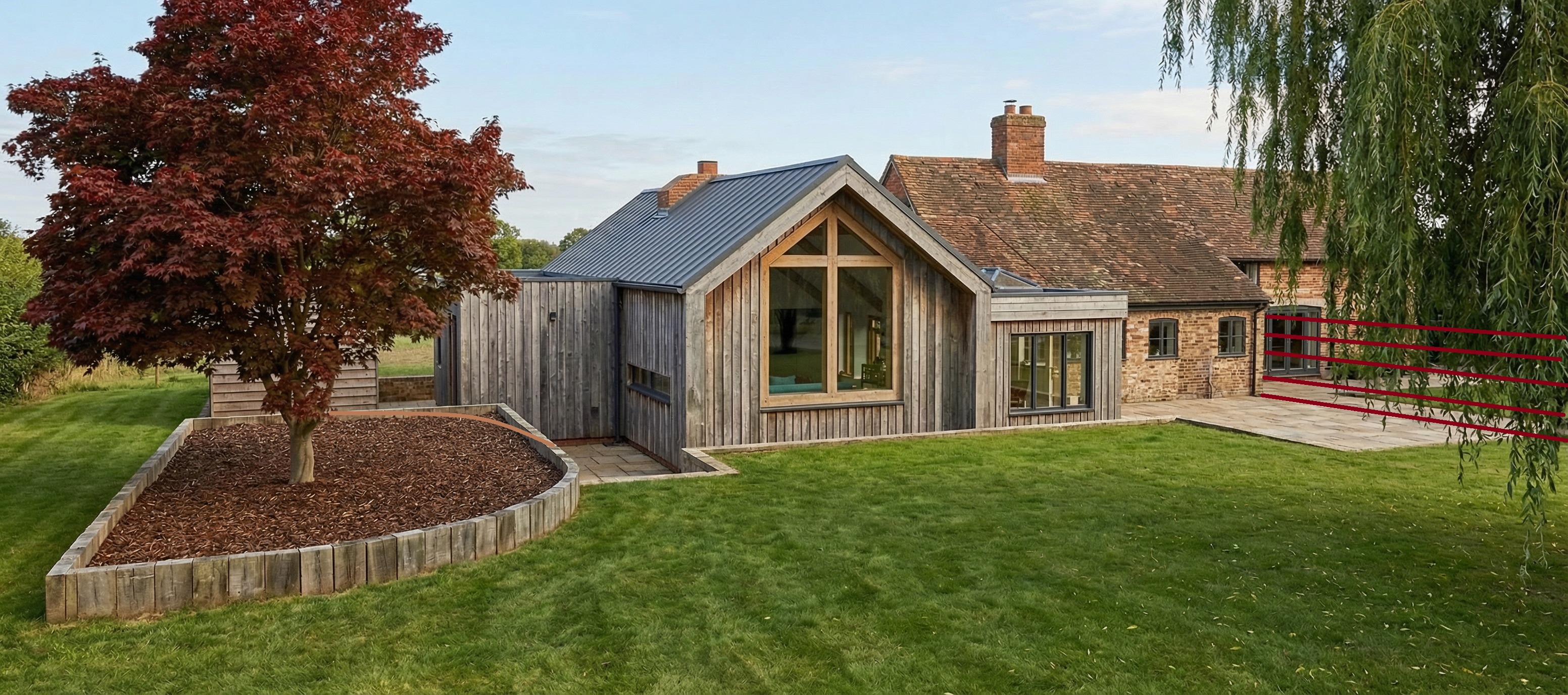 install a 6ft concrte post a closeboard fence along the red lines make the retaining sleepers and bark area curve along the brown line rather than the sharp 90 degree turn