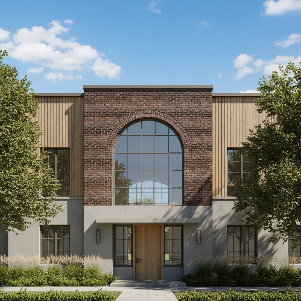 exterior shot use entire elevation make roof black shingles add landscaping turn interior lights on architecture