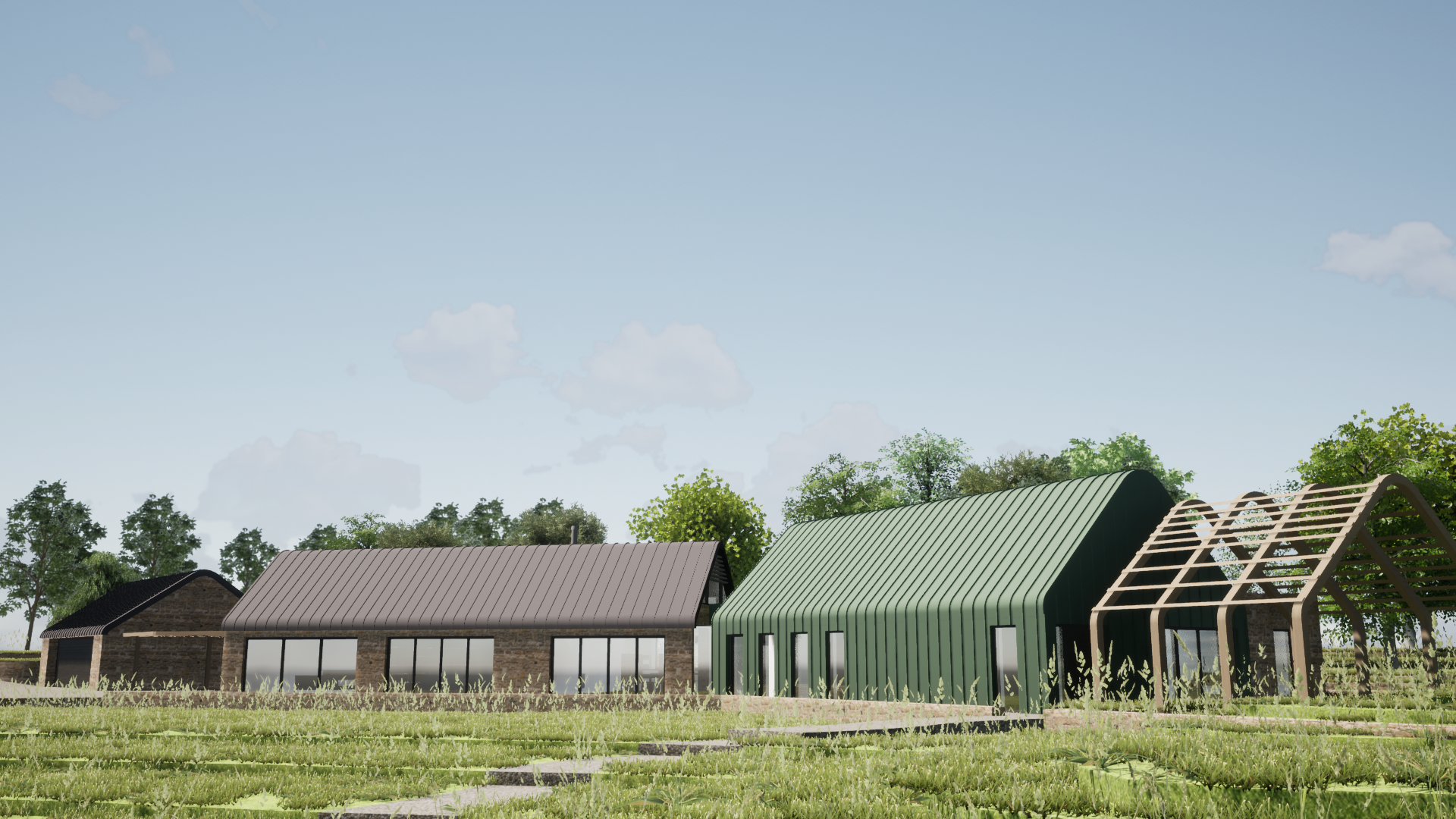 contemporary exterior shot contemporary cotswold stone house with green zinc roof hyper realistic architecture