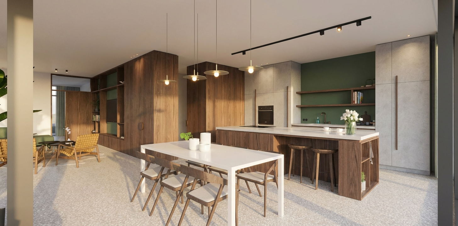 use the provided enscape render as the exact spatial and compositional reference do not change room geometry window placement or camera angle keep and refine materials and landscape roof is a greyish golden satin metal roof add a few seated people around the existing tables