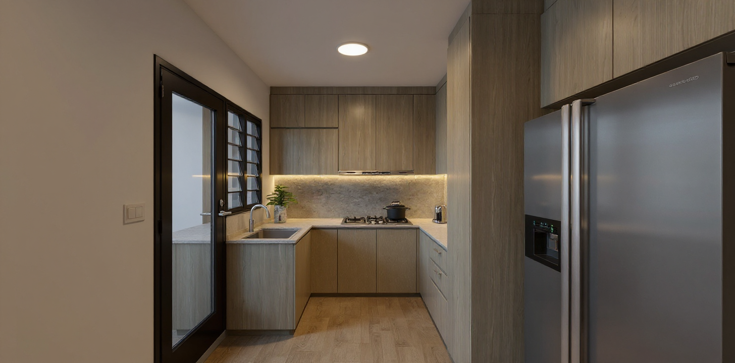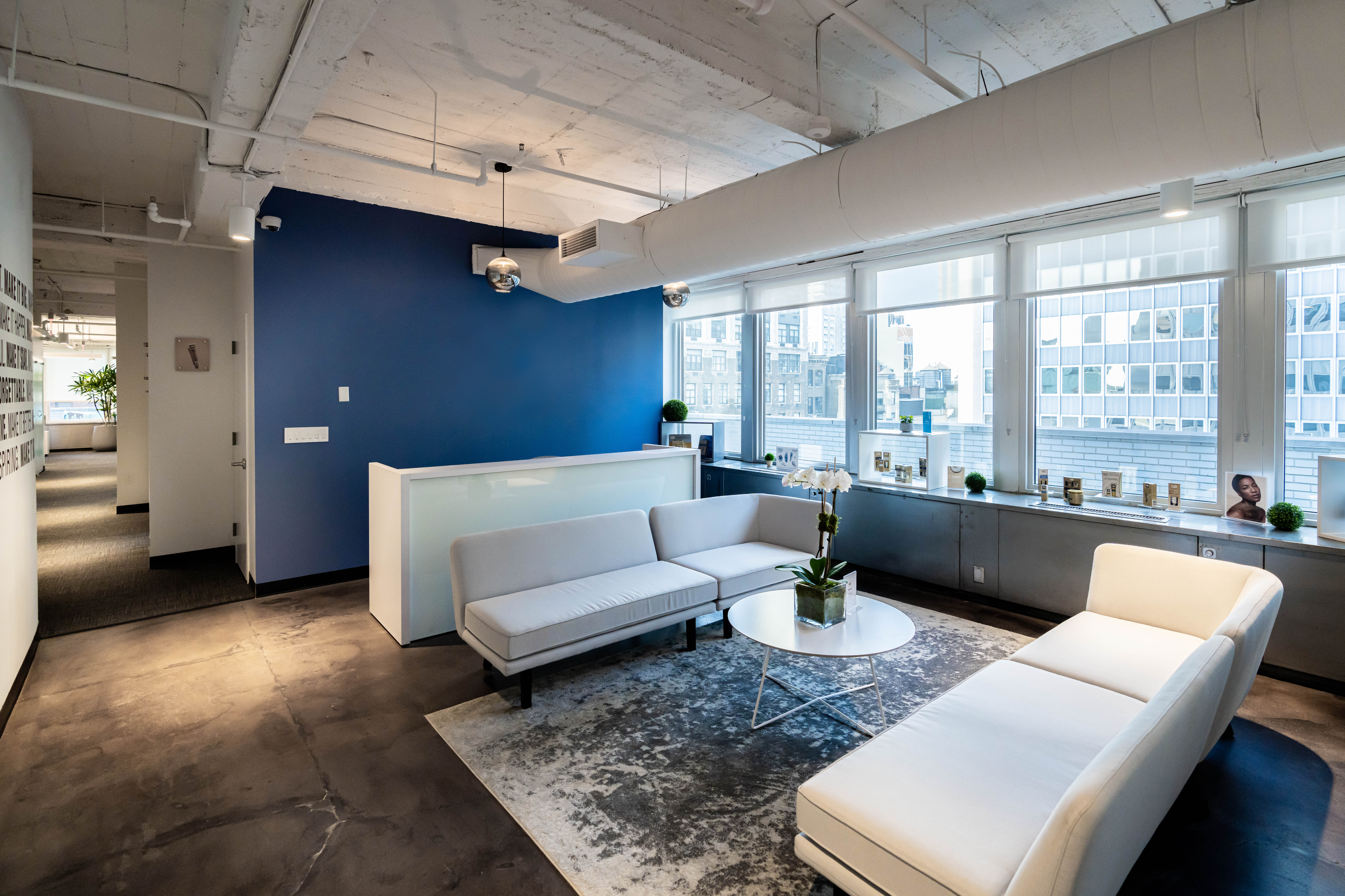 create a modern office space with a sleek and sophisticated atmosphere the main wall is a rich navy blue complemented by pristine white ceilings and ductwork utilize large windows to let in abundant natural light reflecting off the sleek cityscape outside the flooring is a polished concrete with a soft gray tone adding an industrial edge incorporate minimalist white lounge furniture including a sectional sofa and a round coffee table a neutral toned area rug provides subtle texture and small green plants add a touch of nature the lighting is warm and inviting enhancing the modern and elegant aesthetic