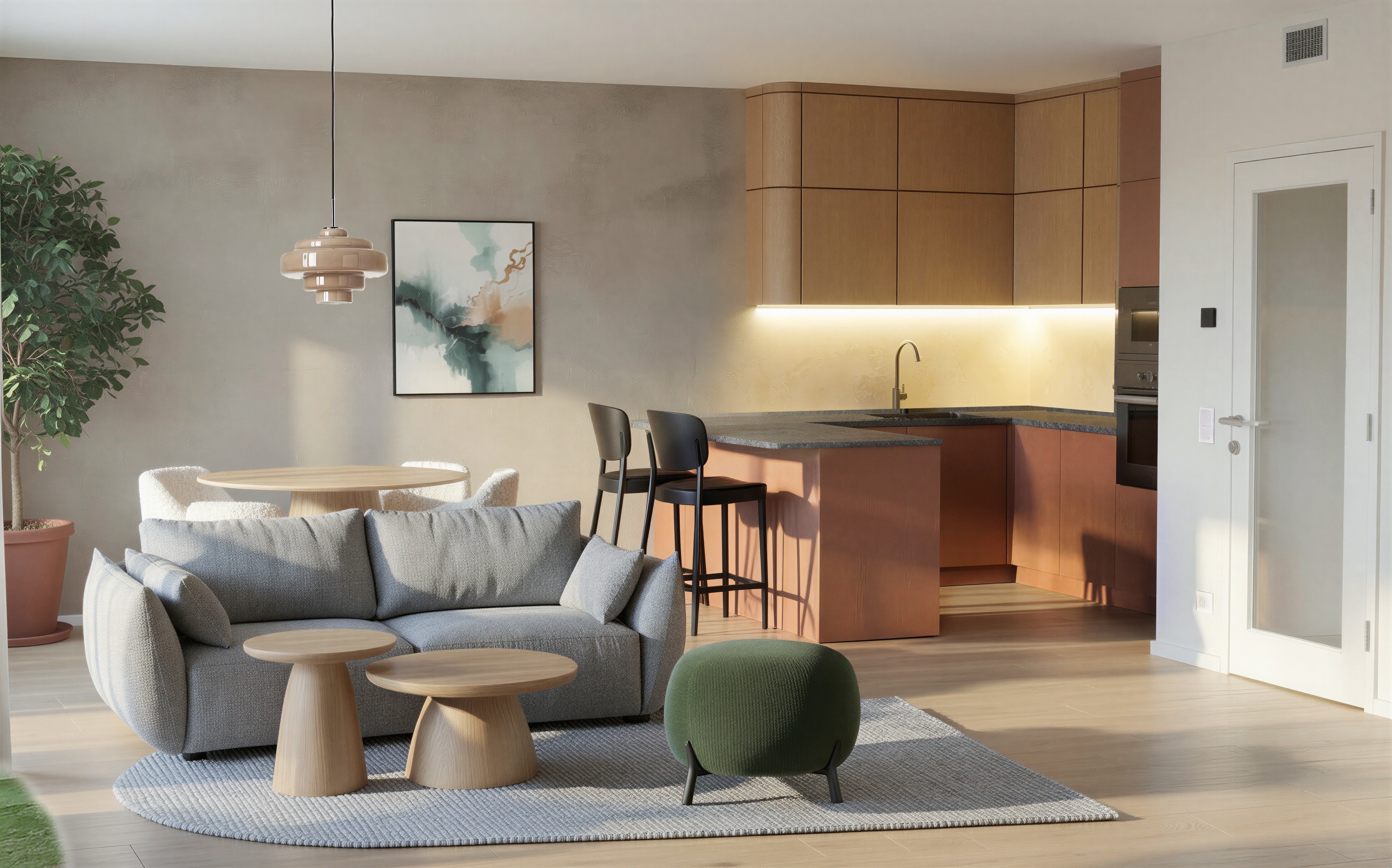 use the provided render as the base image keep the camera angle layout furniture placement architecture and proportions exactly the same do not change the position of any objects adjust the overall atmosphere and color grading so the scene has soft natural daylight the lighting should feel balanced and neutral with only a subtle warm tone avoid strong golden sunlight or overly dramatic lighting the room should feel evenly lit with gentle daylight coming from the left side creating soft and natural shadows add a flower arrangement on the round dining table the flowers should be placed in a small matte ceramic vase with a soft natural beige tone the bouquet should be light airy and natural looking not dense use delicate flowers in soft neutral tones such as off white cream pale beige and very light pastel pink include a mix of small blossoms and a few thin stems with subtle greenery to make the bouquet feel organic and slightly asymmetrical the arrangement should feel elegant minimal and contemporary the flowers should look naturally illuminated by the soft daylight from the left side of the room do not modify any other objects materials or furniture in the scene only adjust the lighting mood and add the described flower arrangement on the table