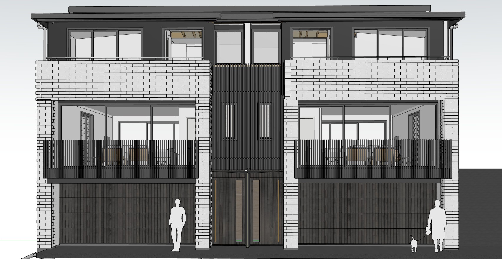 render a modern sleek two story building with a minimalist design the structure features a white brick facade contrasted by charcoal black accents creating a sharp contemporary look large glass windows on both upper floors reflect the serene surroundings bathing the interior in natural light the balconies are bordered by elegant black railings the main entrance consists of understated wooden cedar doors with subtle highlights the lower floor has soft cedar garge doors the atmosphere is calm yet sophisticated illuminated by soft ambient lighting against a clear evening sky integrate lush greenery around the entrance and a gentle pathway leading up to the building enhancing the inviting ambiance