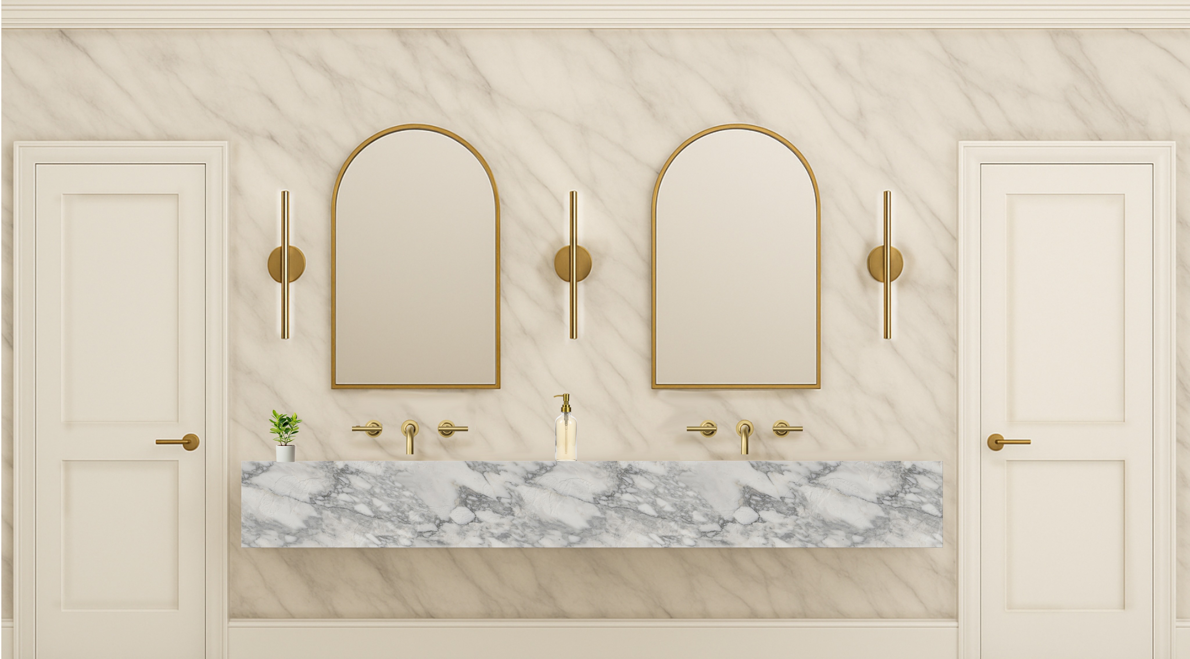 elevation with two white doors on each side with gold hardware large slab wall mount sink with dark grey veining two wall mounted gold faucets 3 gold scones on the wall in between two large gold arched mirrors add crown molding wall is full floor to ceiling subway tiles that is an off white taupe color with gloss finish have view be a flat elevation view