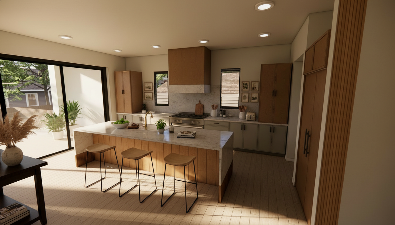 same camera view modern flat remove all pipes increase window height don t add windows flowy white linen curtains full height wardrobe with rattan on the light oak doors hidden lights and pots on the false ceiling tone should be inviting and relaxing all walls to be smooth off white no plants earthy tones large art on the wall behind the bed modern lamps on both nightstands 2 small armchairs on the left hand side