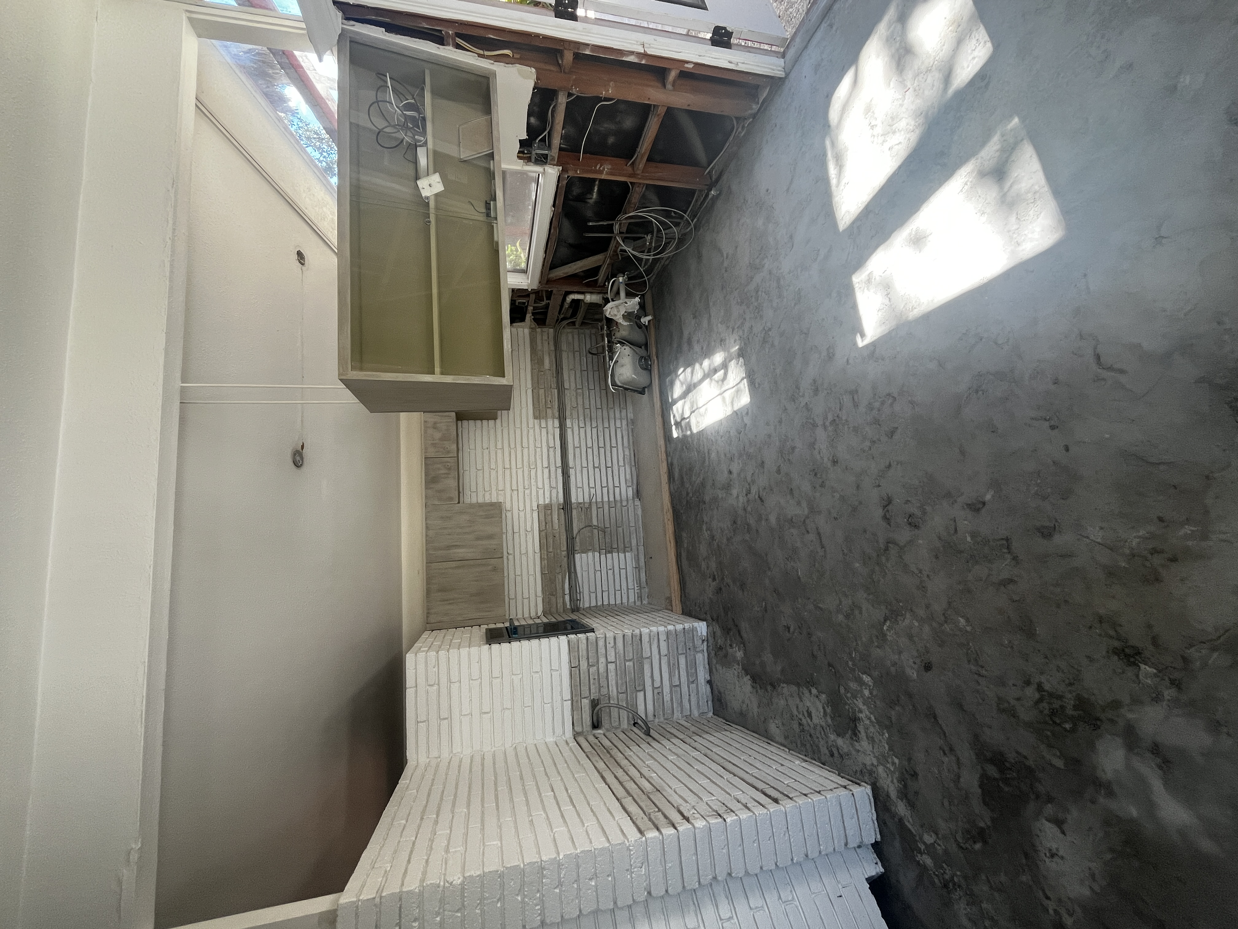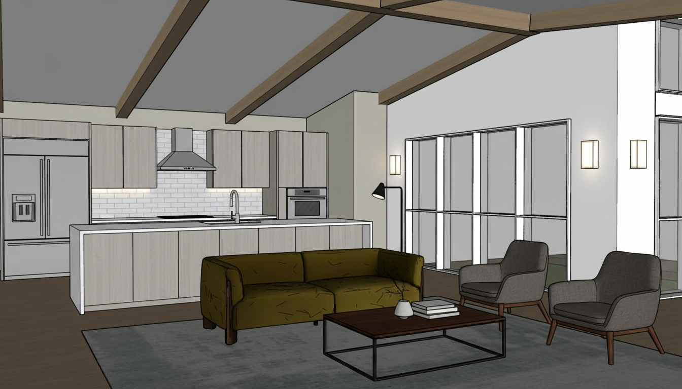 make this a mid centric kitchen with white and blue terrazo floors keep exstiting cabinets but make the cabinets a white or light oak color architecture