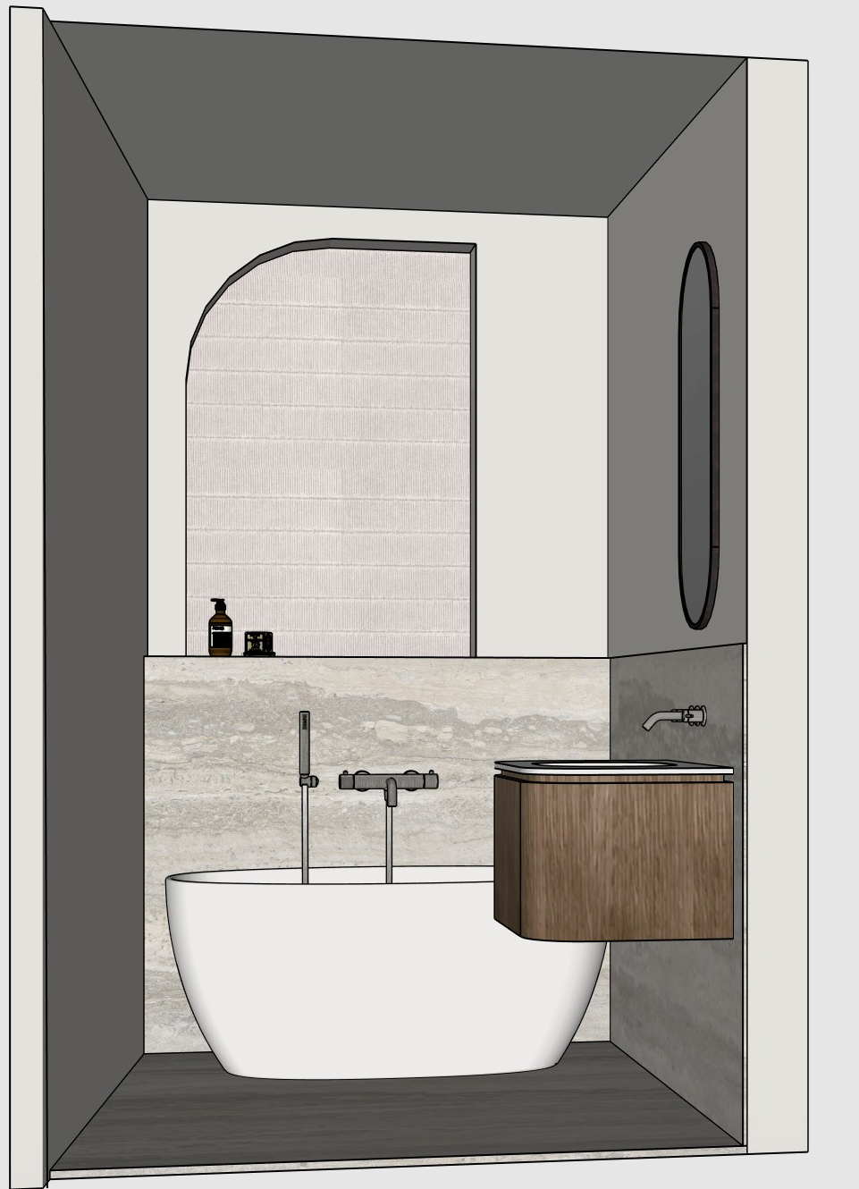 the walls should be lightly plastered the floor should be light beige like the walls the sink is also beige in the arch there are thin lined tiles the lines of the tiles are very light and subtle there is travertino silver on the lower part of the wall behind the bathtub and the vanity there is soft warm light under the top of the arch