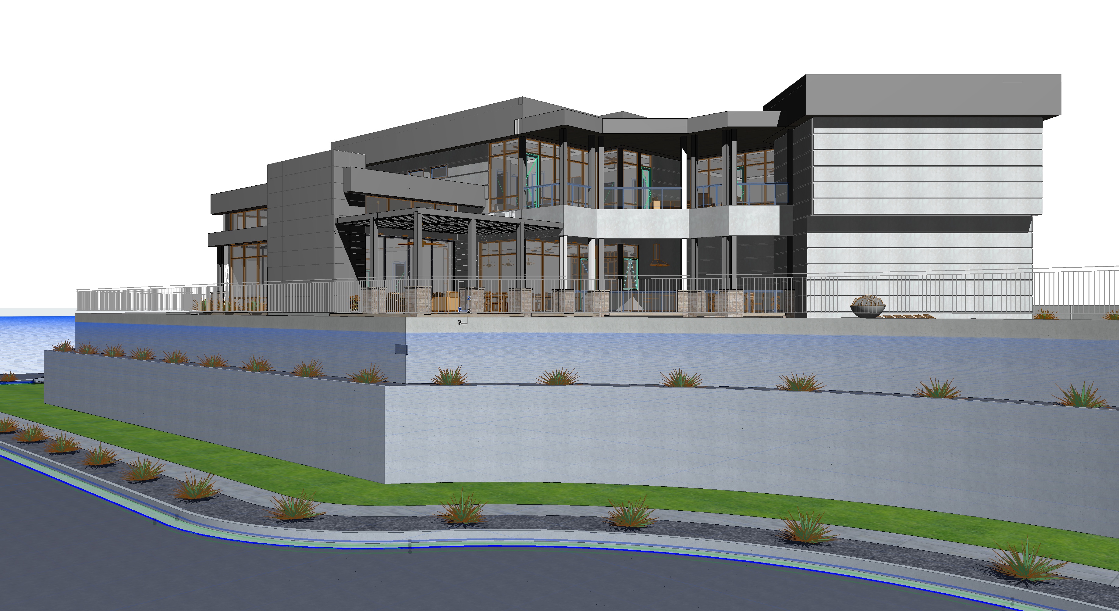 produce a photorealistic 3d rendering exterior materials are off white stucco brown grey stone accents black metal roof fascia medium brown wood soffits dark tinted windows in black metal frame black metal columns include a desert hillside background include desert landscaping including yucca plants cactus palm trees grass gravel and rocks produce rendering with evening lighting and include landscape lighting soffit lighting and architectural accent lighting remove green triangles in glass doors that represent door opening direction architecture