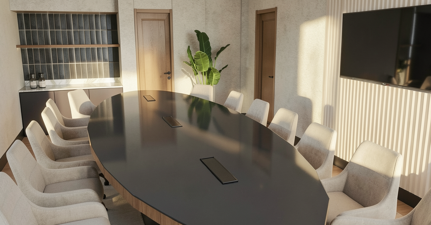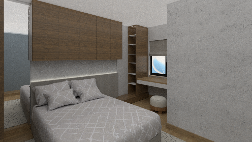 create a cozy modern bedroom scene with a minimalist design feature a soft gray textured wall on the right and a wooden floor with warm brown tones include a bed with a light gray comforter and decorative pillows both with subtle geometric patterns add wooden cabinets above the bed and a matching wooden desk with integrated shelves to the right place a small round ottoman with a white cushion and wooden base in front of the desk incorporate a window with a subtle blue sky outside enhancing natural light set a soothing and calm atmosphere with soft diffused lighting throughout the room add some books and decoration on shelves on the left side of the bed there is a mirror dimmed antque style from ceiling to floor