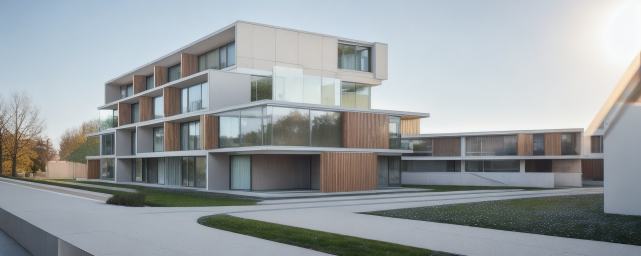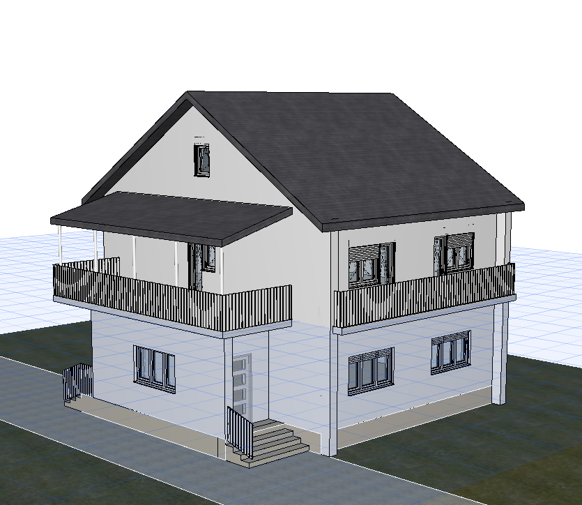 photorealistic architectural render of a modern two story family house keeping the exact existing shape proportions and layout from the reference image the facade features a refined modern design main surfaces in warm off white or beige tones with subtle wooden or wood textured accents on the recessed sections the roof is anthracite window and door frames are anthracite gray and the balcony and stair railings are painted white wood clean contemporary european residential style natural daylight realistic materials and textures soft shadows balanced color palette ultra detailed professional architectural visualization