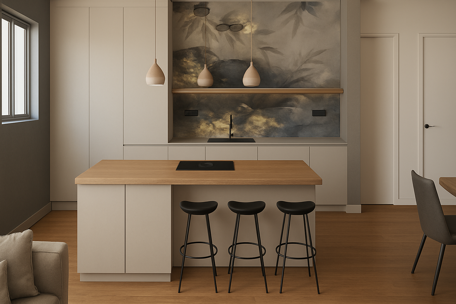 do not change anything in the existing image except the wall area centered above the bed keep the bed furniture lighting colors materials camera angle and atmosphere exactly identical on the wall centered above the bed add a minimal sculptural wall installation the installation consists of a limited number of small organic porcelain elements inspired by cocoa beans 10 cm each the pieces are individually mounted evenly spaced forming a restrained and elegant composition luxury hotel interior contemporary refined understated