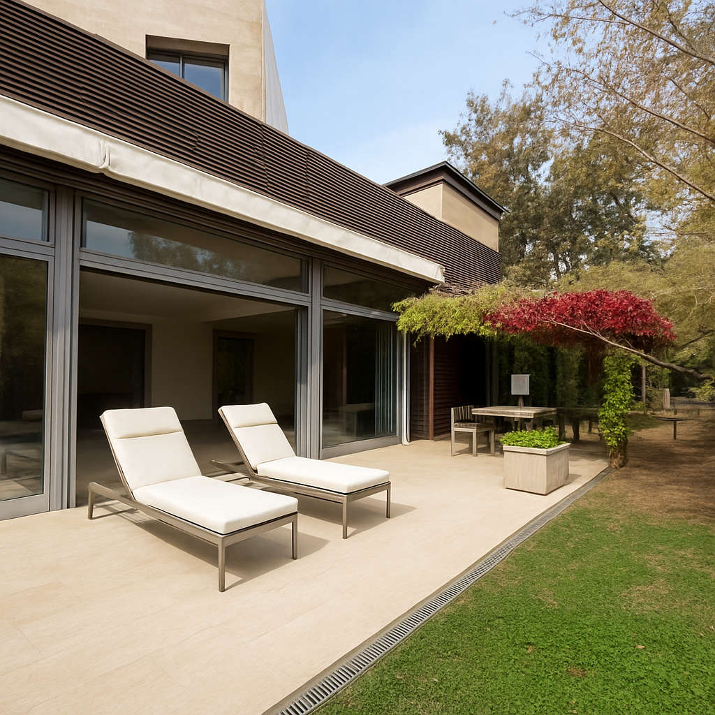 poner todo el cesped verde y en el interior hay una piscina de spa que se tendria que ver la rejilla de desague tambien que no se vea que continue el pavimiento porcelanico
