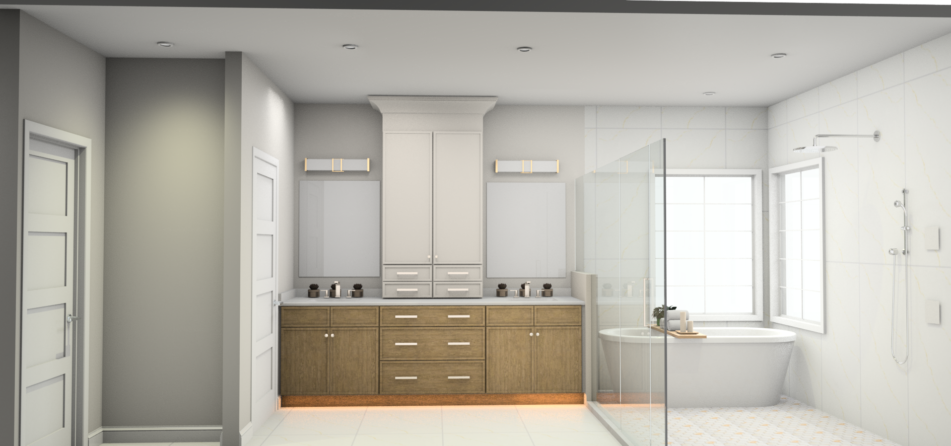 make the lights satin nickel color and add nickel color freestanding tub filler behind the center tub