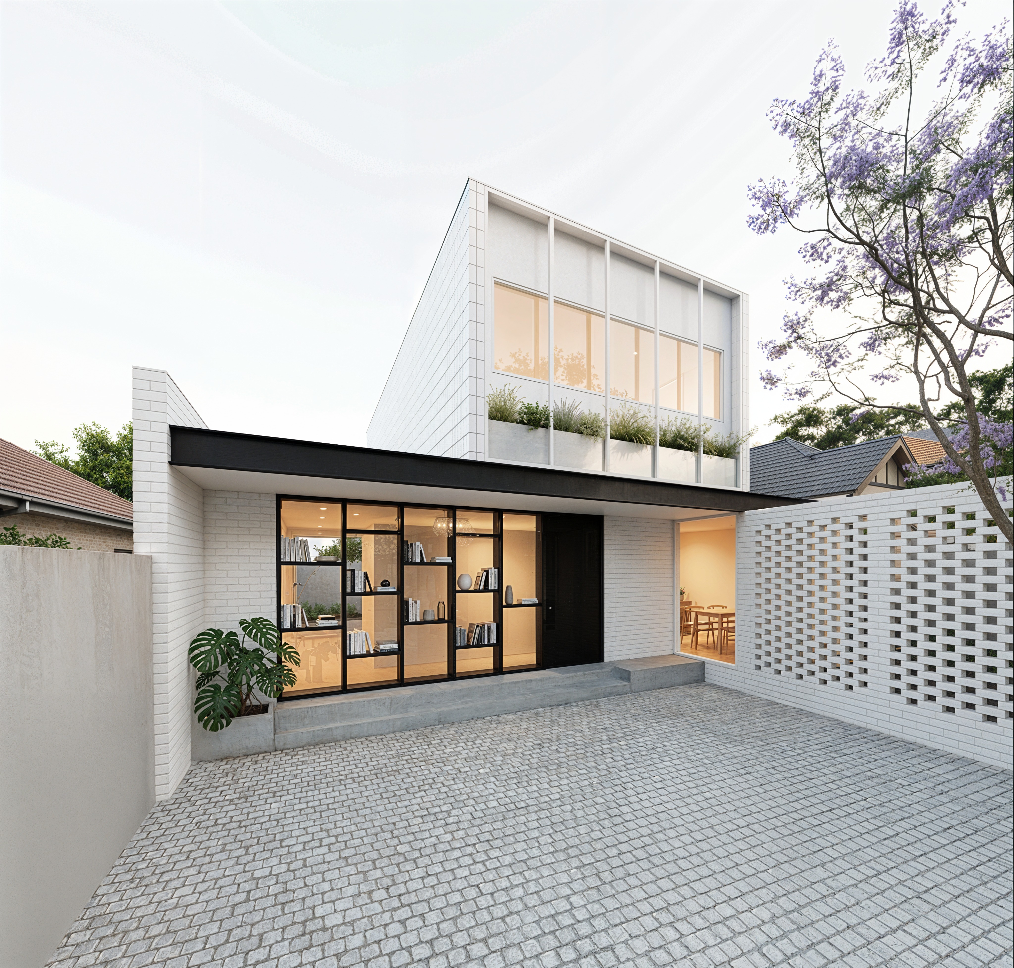 exterior image it is very important not to change the base geometry there is a metal beam between the upper and lower volumes it is a c shaped metal beam with the open side facing outward the beam must be white add plants inside the concrete block to the right of the entrance door using the same type of plants as the planter on the left side on the left side of the image show the branch arm of a large tree the tree should cast natural shadows over the exterior paving stones the tree must not block or hide the building keep everything else exactly as it is