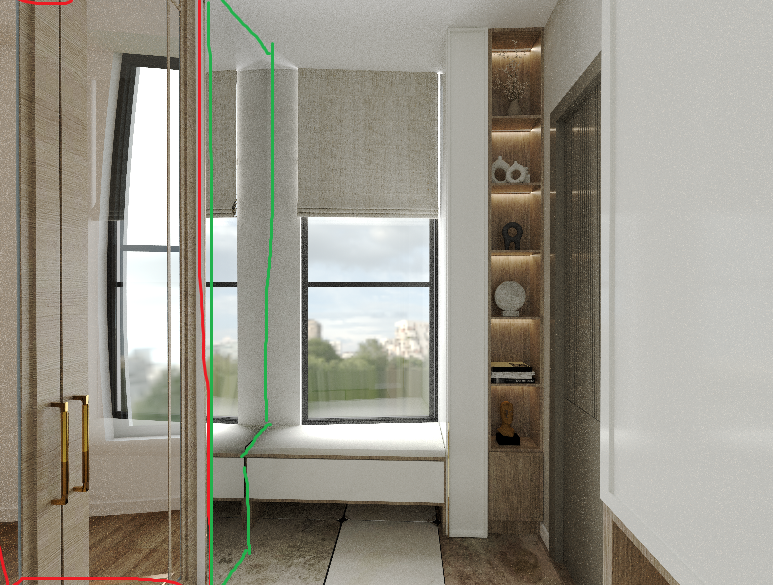photorealistic interior render keep exact design unchanged left side has a transparent glass door directly next to it a full height wall mirror panel clear mirror no frame mirror aligned vertically from floor to ceiling modern hallway with window bench and built in shelves soft natural light from window subtle warm artificial lighting 3000 3500k balanced exposure no overexposed window realistic reflections in both glass door and mirror clean bright atmosphere high detail materials no noise ultra sharp high end minimal luxury style