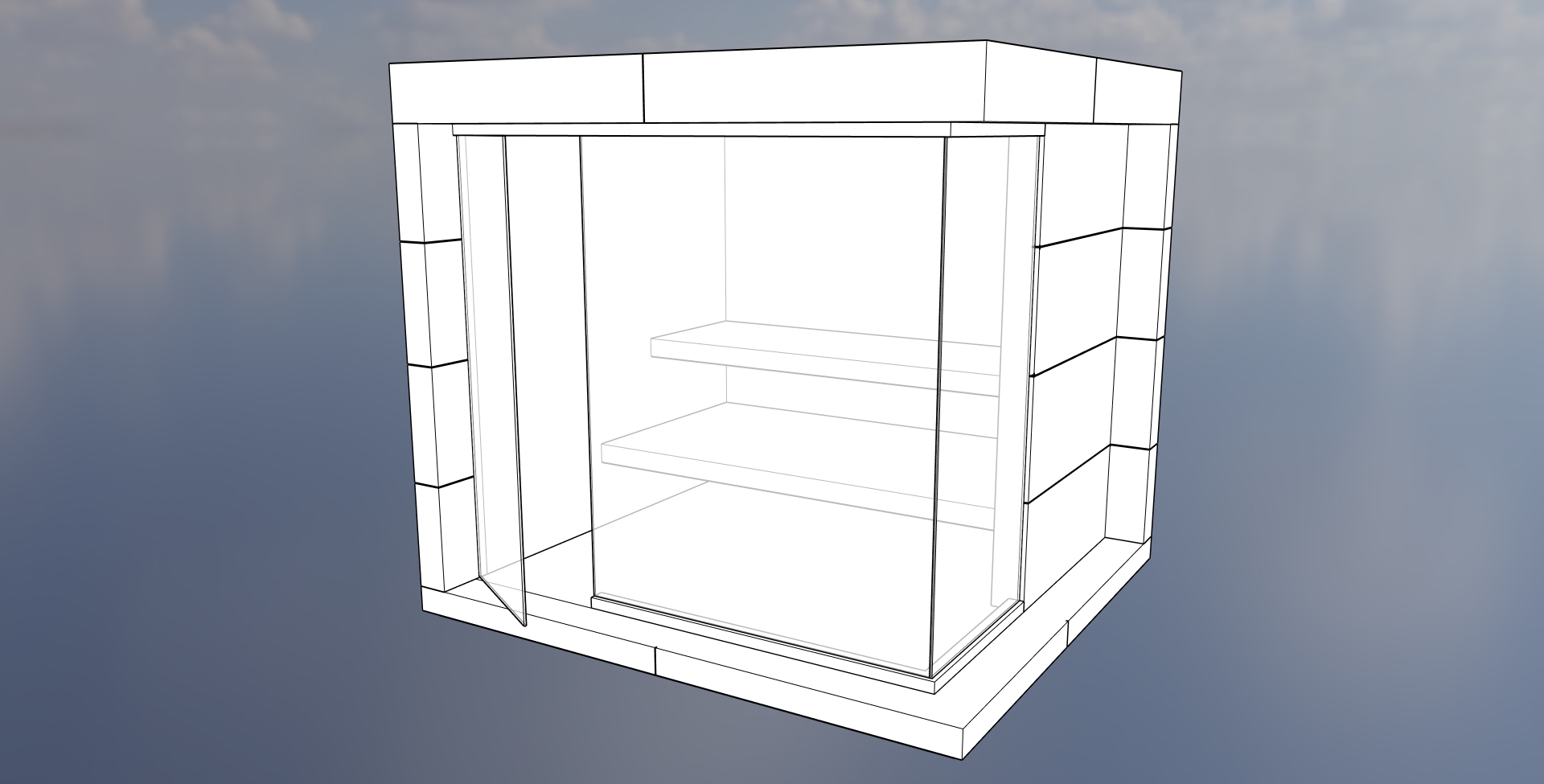 photorealistic product render of a modern outdoor sauna based on a minimal cubic design exterior facade made of black fundermax max compact panels deep matte black industrial look panels arranged in a clean grid with clearly visible narrow shadow gaps between panels sharp edges precise construction no rounded corners front full height grey tinted glass wall with slim black aluminium frame glass should look thick and architectural not glossy or decorative interior light thermo wood interior with horizontal wooden boards two level sauna benches made from the same light thermo wood clean minimal premium finish lighting soft neutral architectural lighting subtle indirect interior light no dramatic mood style ultra minimalist premium industrial outdoor wellness product studio background neutral grey floor no people no plants no environment high realism sharp focus no artistic stylization